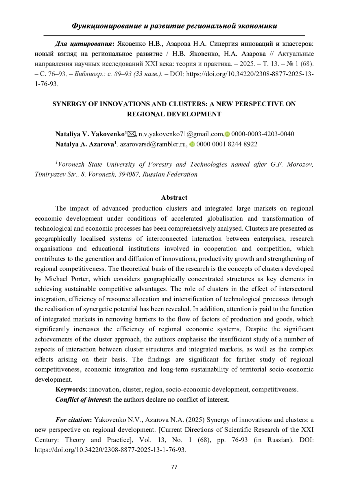 В статье проводится всесторонний анализ влияния передовых производственных кластеров и объединённых крупных рынков на региональное экономическое развитие в условиях ускоренной глобализации и трансформации технологических и экономических процессов. Кластеры представлены как географически локализованные системы взаимосвязанного взаимодействия предприятий, научно-исследовательских организаций и образовательных учреждений, вовлечённых в кооперацию и конкуренцию, что способствует генерации и диффузии инноваций, росту производительности и укреплению региональной конкурентоспособности. Теоретической основой исследования служат концепции кластеров, разработанные Майклом Портером, которые рассматривают географически сконцентрированные структуры как ключевые элементы достижения устойчивых конкурентных преимуществ. Освещается их роль в эффекте межотраслевой интеграции, эффективности распределения ресурсов и интенсификации технологических процессов посредством реализации синергетического потенциала. Кроме того, уделяется внимание функции объединённых рынков в устранении барьеров для перетока факторов производства и товаров, что значительно увеличивает эффективность функционирования региональных экономических систем. Несмотря на значительные достижения кластерного подхода, авторы подчёркивают недостаточную изученность ряда аспектов взаимодействия кластерных структур и объединённых рынков, а также комплексных эффектов, возникающих на их основе. Полученные выводы представляют значимость для дальнейшего изучения конкурентоспособности регионов, экономической интеграции и долгосрочной устойчивости территориального социально-экономического развития.