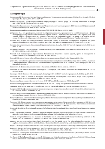 22. Чернухин Е.К. “Иностранные” корреспонденты архимандрита Антонина (Капустина): обзор документов 1865-1894 г.г., хранящихся в институте рукописи национальной библиотеки им. В.И. Вернадского // Иерусалимский вестник Императорского православного палестинского общества. 2015. № 7-8. С. 185-204.