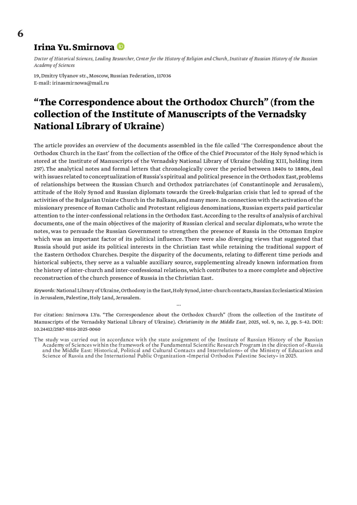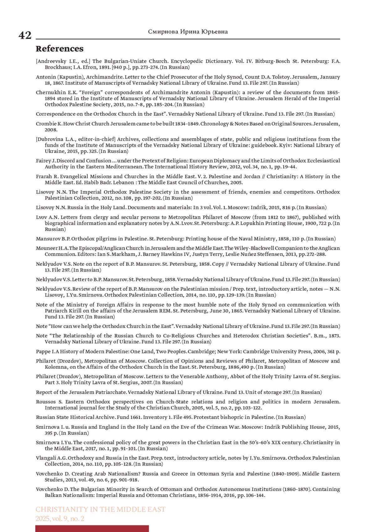19. Смирнова И. Ю. Конфессиональная политика великих держав на Христианском Востоке в 50-60-е гг. XIX в. // Христианство на Ближнем Востоке. 2017. № 1. С. 91-101.