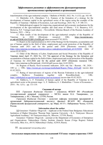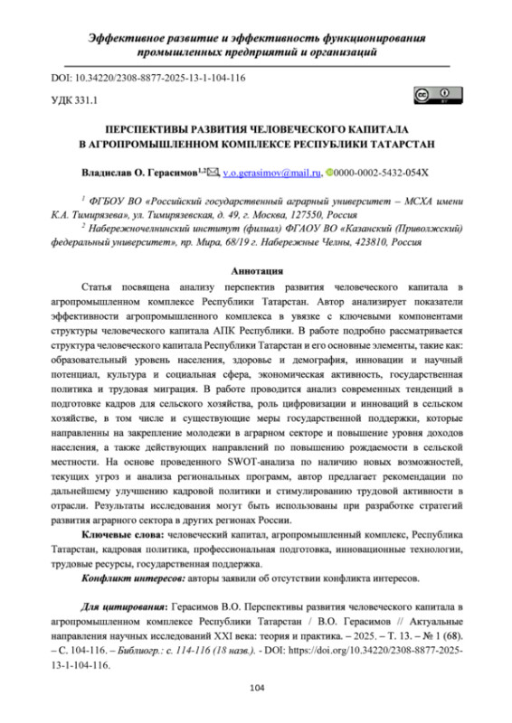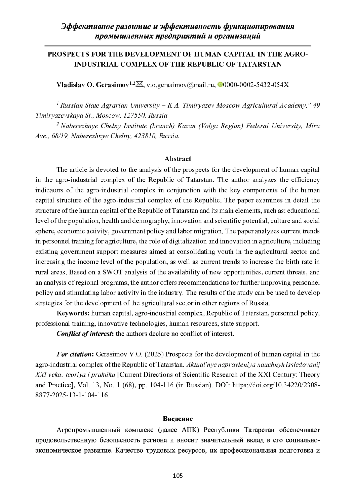 ГЕРАСИМОВ В. О. ПЕРСПЕКТИВЫ РАЗВИТИЯ ЧЕЛОВЕЧЕСКОГО КАПИТАЛА В АГРОПРОМЫШЛЕННОМ КОМПЛЕКСЕ РЕСПУБЛИКИ ТАТАРСТАН // АКТУАЛЬНЫЕ НАПРАВЛЕНИЯ НАУЧНЫХ ИССЛЕДОВАНИЙ XXI ВЕКА: ТЕОРИЯ И ПРАКТИКА. 2025. Т. 13 № 1 (68)