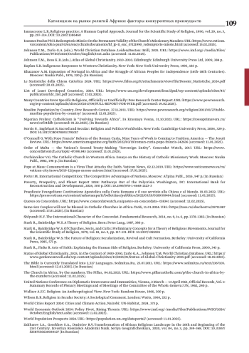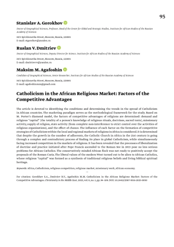 ГОРОХОВ С. А., ДМИТРИЕВ Р. В., АГАФОШИН М. М. КАТОЛИЦИЗМ НА РЫНКЕ РЕЛИГИЙ АФРИКИ: ФАКТОРЫ КОНКУРЕНТНЫХ ПРЕИМУЩЕСТВ // ХРИСТИАНСТВО НА БЛИЖНЕМ ВОСТОКЕ. 2025. № 1, ТОМ 9