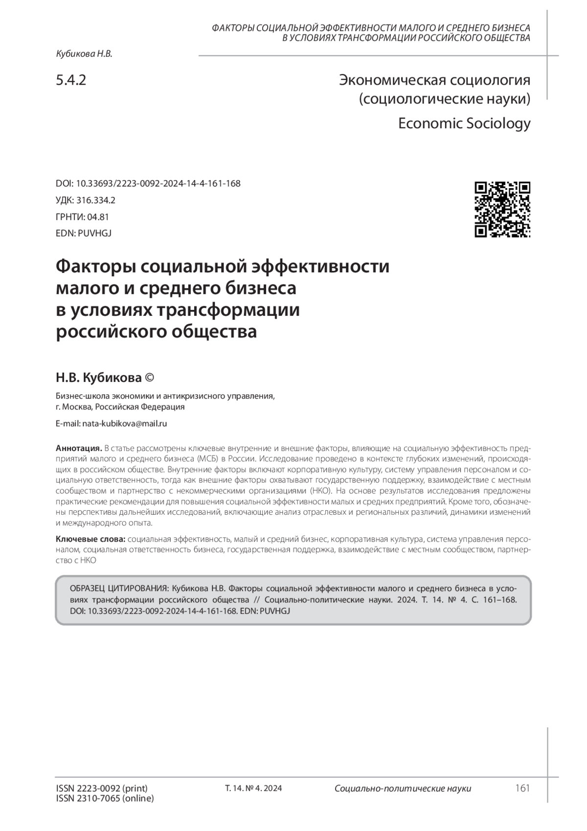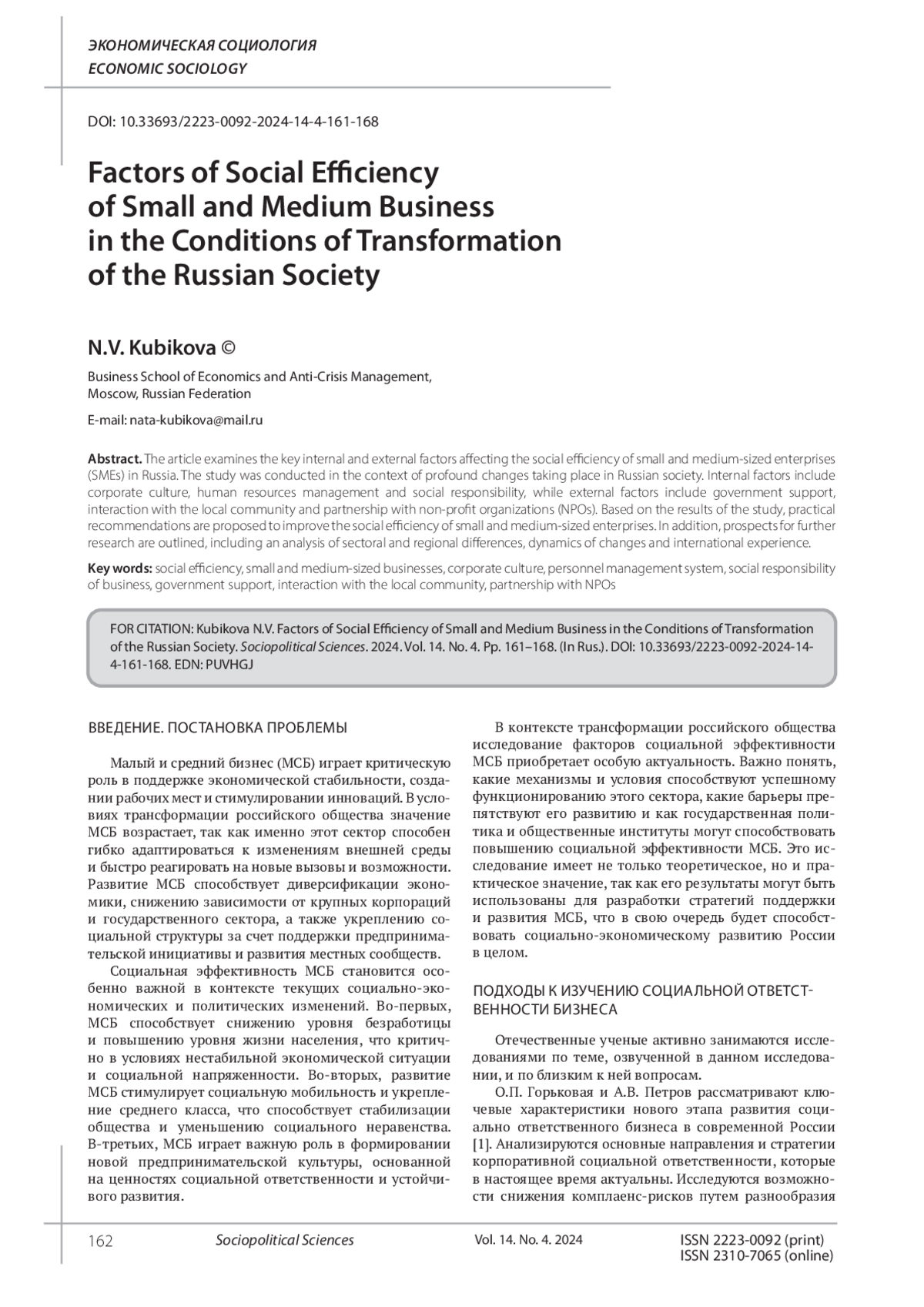 В статье рассмотрены ключевые внутренние и внешние факторы, влияющие на социальную эффективность предприятий малого и среднего бизнеса (МСБ) в России. Исследование проведено в контексте глубоких изменений, происходящих в российском обществе. Внутренние факторы включают корпоративную культуру, систему управления персоналом и социальную ответственность, тогда как внешние факторы охватывают государственную поддержку, взаимодействие с местным сообществом и партнерство с некоммерческими организациями (НКО). На основе результатов исследования предложены практические рекомендации для повышения социальной эффективности малых и средних предприятий. Кроме того, обозначены перспективы дальнейших исследований, включающие анализ отраслевых и региональных различий, динамики изменений и международного опыта.