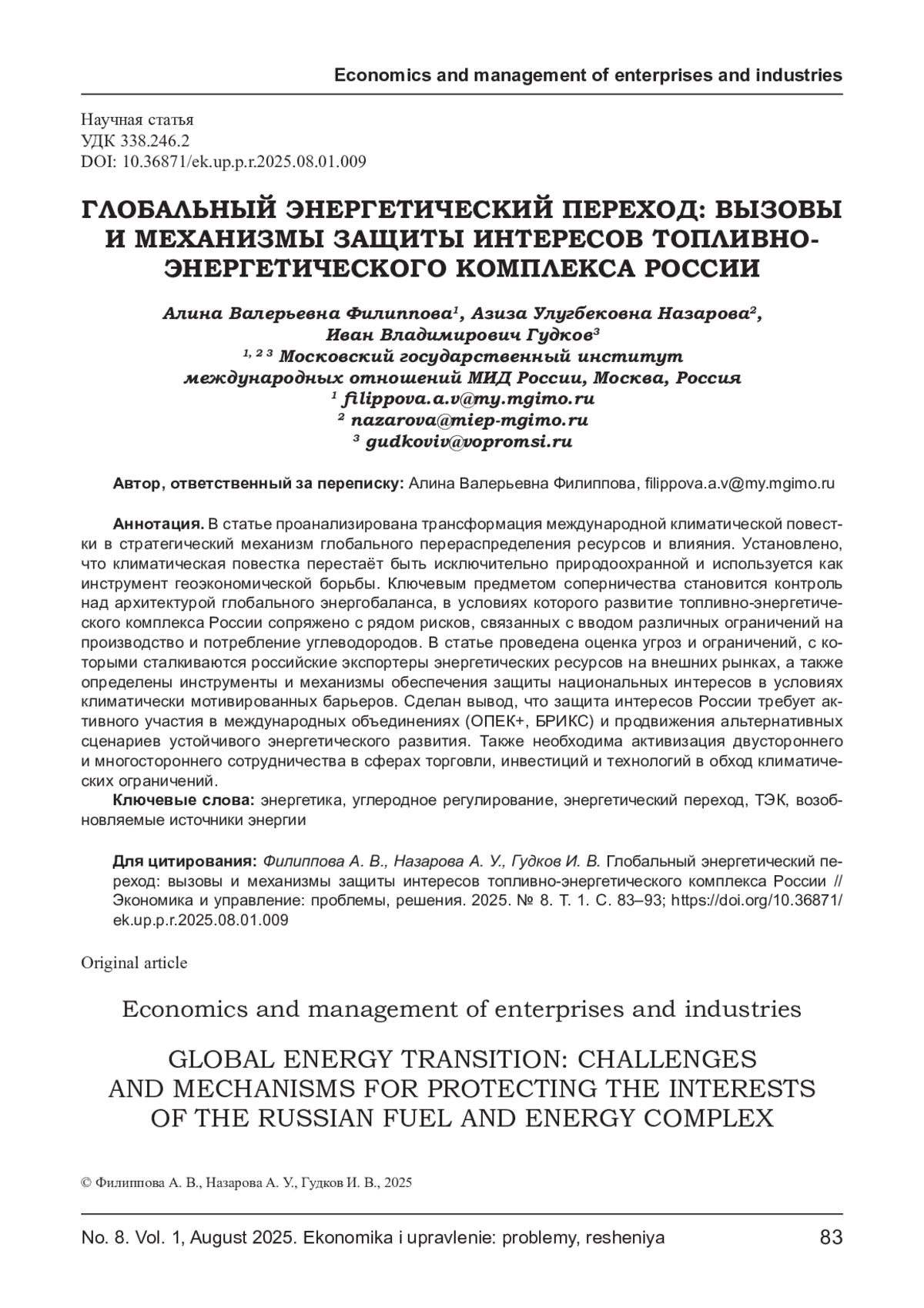 В статье проанализирована трансформация международной климатической повестки в стратегический механизм глобального перераспределения ресурсов и влияния. Установлено, что климатическая повестка перестаёт быть исключительно природоохранной и используется как инструмент геоэкономической борьбы. Ключевым предметом соперничества становится контроль над архитектурой глобального энергобаланса, в условиях которого развитие топливно-энергетического комплекса России сопряжено с рядом рисков, связанных с вводом различных ограничений на производство и потребление углеводородов. В статье проведена оценка угроз и ограничений, с которыми сталкиваются российские экспортеры энергетических ресурсов на внешних рынках, а также определены инструменты и механизмы обеспечения защиты национальных интересов в условиях климатически мотивированных барьеров. Сделан вывод, что защита интересов России требует активного участия в международных объединениях (ОПЕК+, БРИКС) и продвижения альтернативных сценариев устойчивого энергетического развития. Также необходима активизация двустороннего и многостороннего сотрудничества в сферах торговли, инвестиций и технологий в обход климатических ограничений.