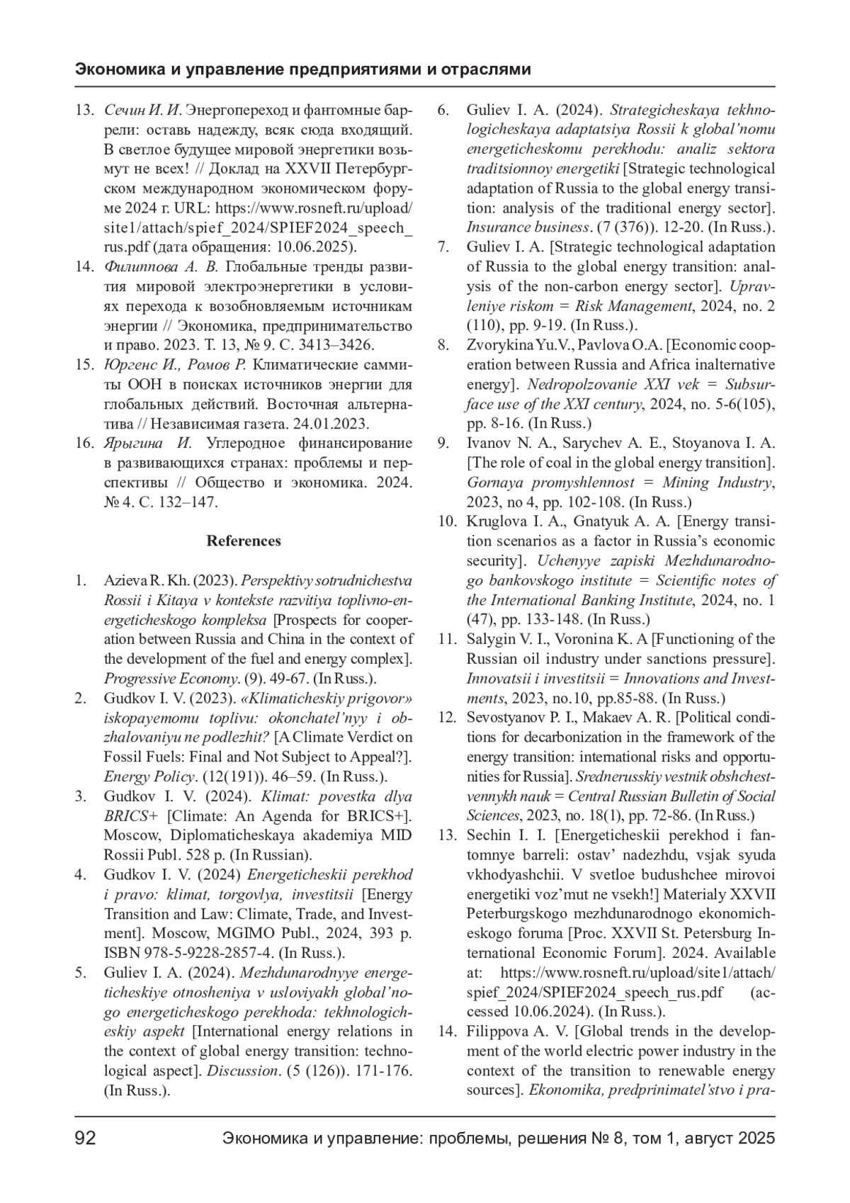 6. Гулиев И. А. Стратегическая технологическая адаптация России к глобальному энергетическому переходу: анализ сектора традиционной энергетики // Страховое дело. 2024. № 7 (376). С. 12-20. EDN: QSKTAM