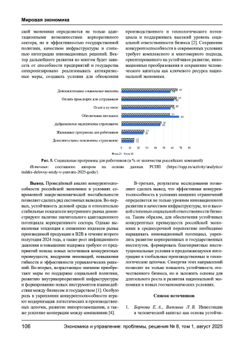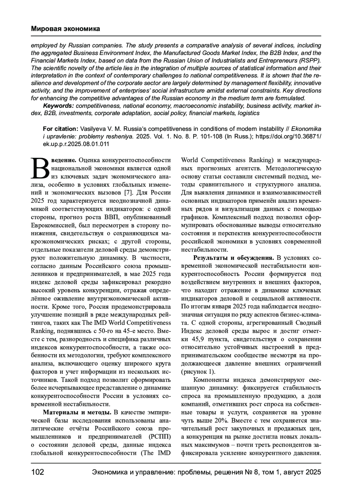 Основная цель исследования заключается в комплексном анализе конкурентоспособности российской экономики в условиях нарастающей макроэкономической нестабильности. В статье рассмотрены ключевые индикаторы деловой активности, финансовые и логистические показатели, а также динамика социальной и инвестиционной активности предприятий по результатам 2024-2025 гг. Особое внимание уделяется состоянию внутреннего рынка, межкорпоративным и государственно-деловым взаимоотношениям, а также специфике адаптационных стратегий российского бизнеса. В статье проведён сравнительный анализ ряда индексов, таких как агрегированный Индекс деловой среды, индекс рынка производимой продукции, индекс B2B и индекс финансовых рынков, на основе данных РСПП. Научная новизна статьи состоит в интеграции нескольких источников статистической информации и их интерпретации в аспекте современных вызовов национальной конкурентоспособности. Показано, что устойчивость и развитие корпоративного сектора в значительной мере определяются гибкостью управления, инновационной активностью и совершенствованием социальной инфраструктуры предприятий на фоне внешних ограничений. Сформулированы ключевые направления повышения конкурентных преимуществ российской экономики в среднесрочной перспективе.
