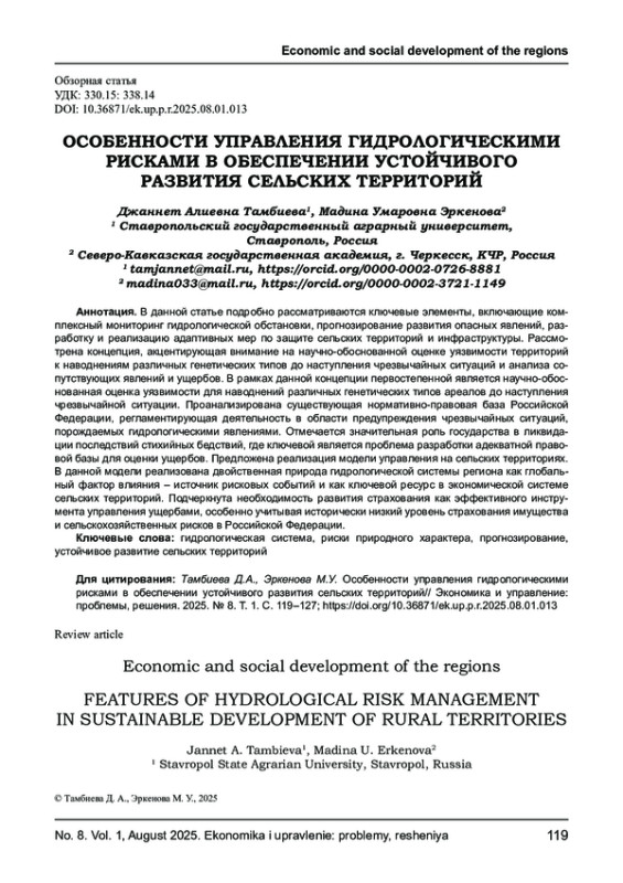 В данной статье подробно рассматриваются ключевые элементы, включающие комплексный мониторинг гидрологической обстановки, прогнозирование развития опасных явлений, разработку и реализацию адаптивных мер по защите сельских территорий и инфраструктуры. Рассмотрена концепция, акцентирующая внимание на научно-обоснованной оценке уязвимости территорий к наводнениям различных генетических типов до наступления чрезвычайных ситуаций и анализа сопутствующих явлений и ущербов. В рамках данной концепции первостепенной является научно-обоснованная оценка уязвимости для наводнений различных генетических типов ареалов до наступления чрезвычайной ситуации. Проанализирована существующая нормативно-правовая база Российской Федерации, регламентирующая деятельность в области предупреждения чрезвычайных ситуаций, порождаемых гидрологическими явлениями. Отмечается значительная роль государства в ликвидации последствий стихийных бедствий, где ключевой является проблема разработки адекватной правовой базы для оценки ущербов. Предложена реализация модели управления на сельских территориях. В данной модели реализована двойственная природа гидрологической системы региона как глобальный фактор влияния - источник рисковых событий и как ключевой ресурс в экономической системе сельских территорий. Подчеркнута необходимость развития страхования как эффективного инструмента управления ущербами, особенно учитывая исторически низкий уровень страхования имущества и сельскохозяйственных рисков в Российской Федерации.