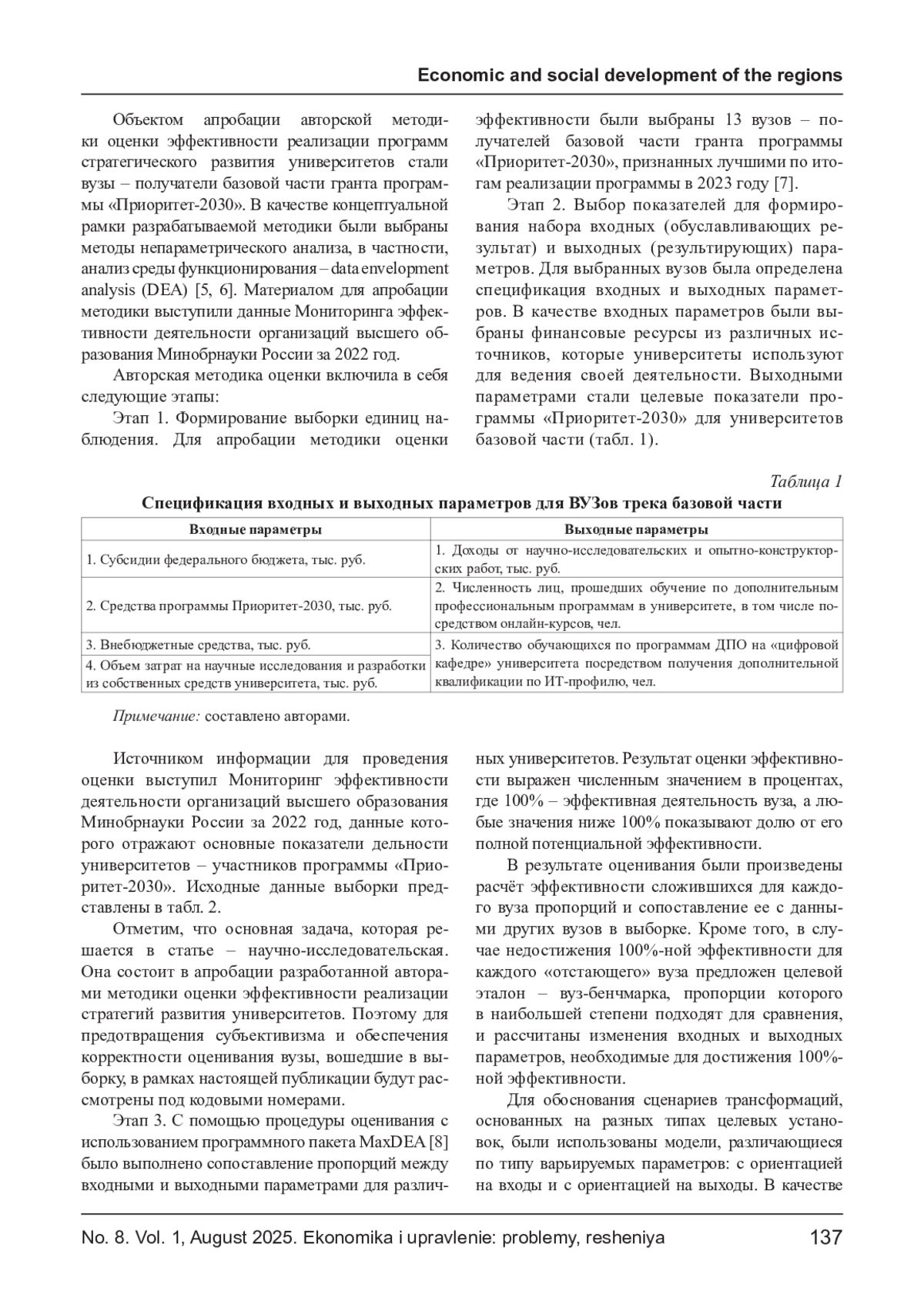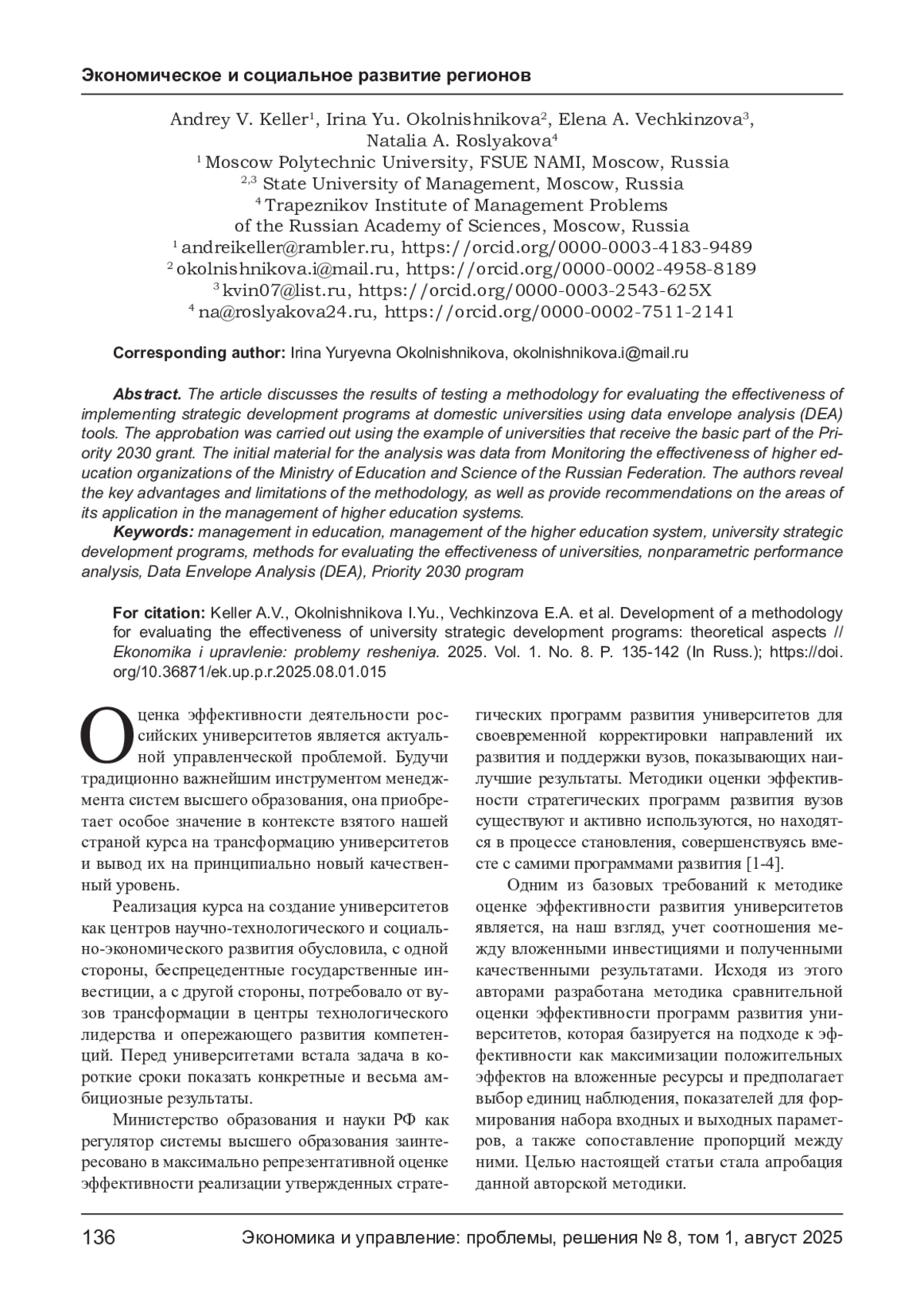 КЕЛЛЕР А. В., ОКОЛЬНИШНИКОВА И. Ю., ВЕЧКИНЗОВА Е. А., РОСЛЯКОВА Н. А. АПРОБАЦИЯ МЕТОДИКИ ОЦЕНКИ ЭФФЕКТИВНОСТИ РЕАЛИЗАЦИИ ПРОГРАММ СТРАТЕГИЧЕСКОГО РАЗВИТИЯ УНИВЕРСИТЕТОВ (НА ПРИМЕРЕ ПОЛУЧАТЕЛЕЙ БАЗОВОЙ ЧАСТИ ГРАНТА ПРОГРАММЫ «ПРИОРИТЕТ-2030») // ЭКОНОМИКА И УПРАВЛЕНИЕ: ПРОБЛЕМЫ, РЕШЕНИЯ. 2025. ТОМ 1 № 8