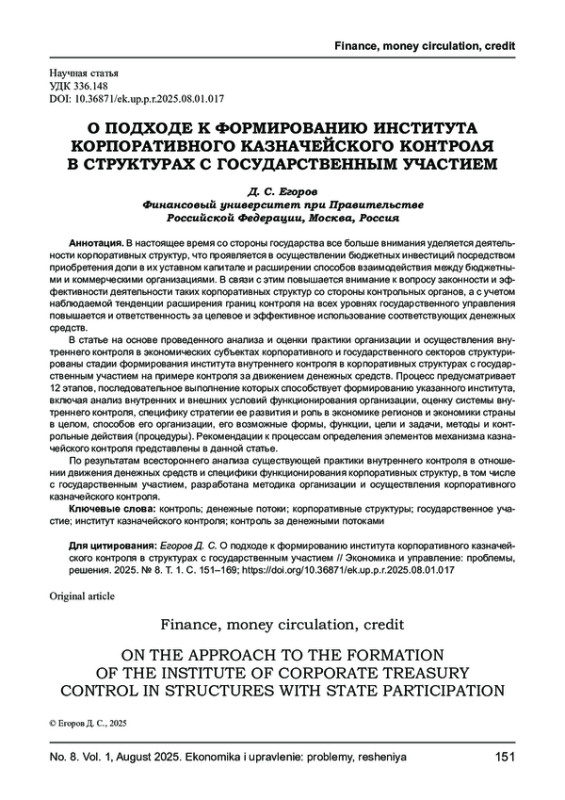 ЕГОРОВ Д. С. О ПОДХОДЕ К ФОРМИРОВАНИЮ ИНСТИТУТА КОРПОРАТИВНОГО КАЗНАЧЕЙСКОГО КОНТРОЛЯ В СТРУКТУРАХ С ГОСУДАРСТВЕННЫМ УЧАСТИЕМ // ЭКОНОМИКА И УПРАВЛЕНИЕ: ПРОБЛЕМЫ, РЕШЕНИЯ. 2025. ТОМ 1 № 8