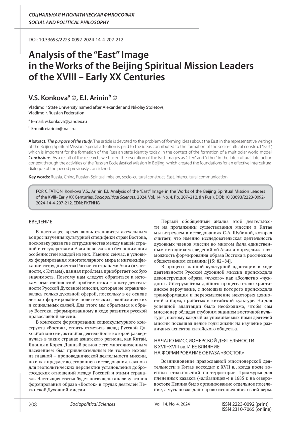 В настоящее время вновь становится актуальным вопрос изучения культурной специфики стран Востока, поскольку развитие сотрудничества между нашей страной и государствами Азии невозможно без понимания особенностей каждой из них. Именно сейчас, в условиях формирования многополярного мира и интенсификации сотрудничества России со странами Aзии (в частности, с Китаем), данная проблема приобретает особую значимость. Поэтому нам следует обратиться к истокам осмысления этой проблематики – опыту деятельности Русской Духовной миссии, которая не ограничивалась только духовной сферой, поскольку в ее основе лежало формирование политических, экономических и социальных связей. Для этого мы обратимся к образу Востока, сформированному в ходе развития русской православной миссии.