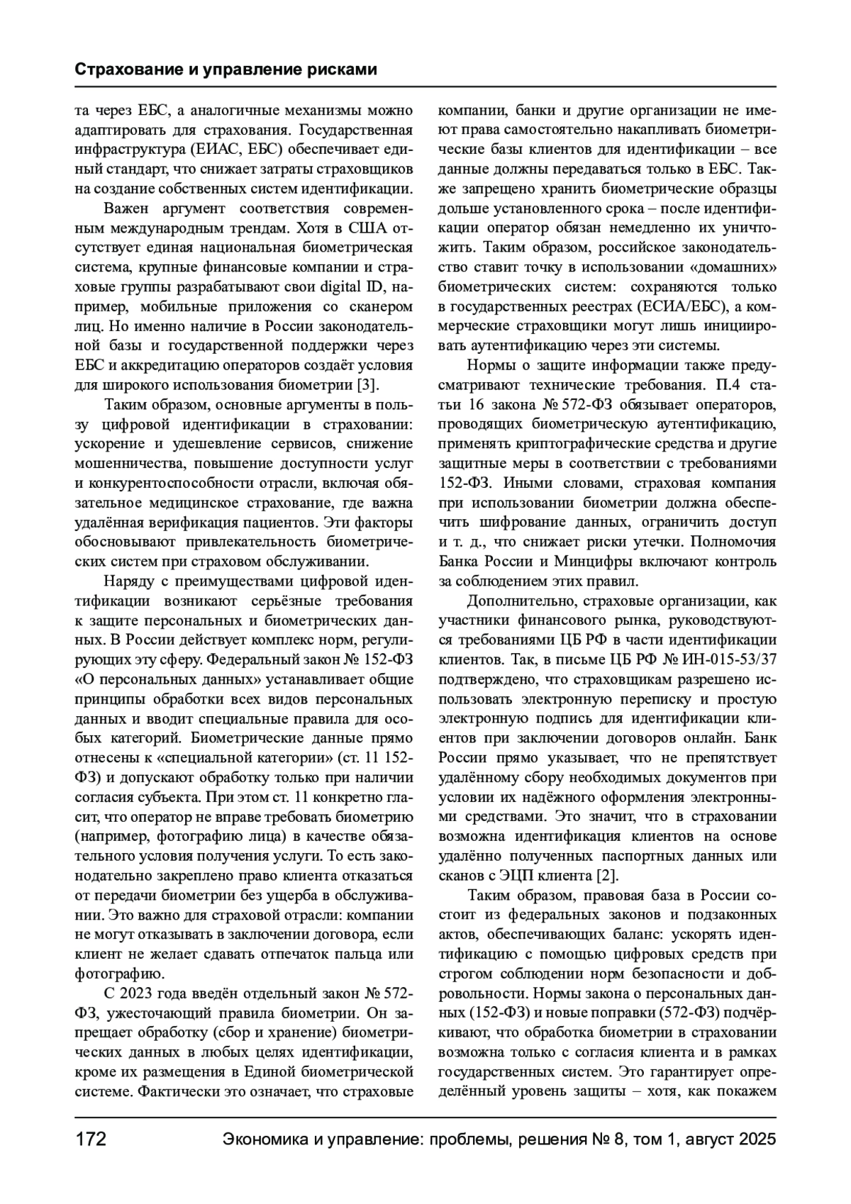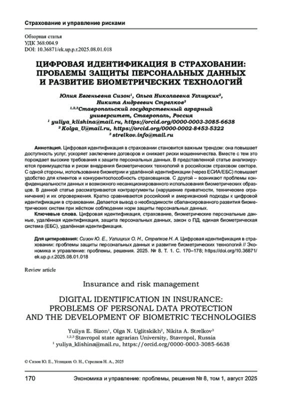 Цифровая идентификация в страховании становится важным трендом: она повышает доступность услуг, ускоряет заключение договоров и снижает риски мошенничества. Вместе с тем это порождает высокие требования к защите персональных данных. В представленной статье анализируются преимущества и риски внедрения биометрических технологий в российском страховом секторе. С одной стороны, использование биометрии и удалённой идентификации (через ЕСИА/ЕБС) повышает удобство для клиентов и конкурентоспособность страховщиков. С другой - возникают проблемы конфиденциальности данных и возможного несанкционированного использования биометрических образцов. В данной статье рассматриваются контраргументы (нарушение приватности, технические ограничения) и их опровержения. Кратко сравниваются российский и американский подходы к цифровой идентификации в страховании. Делается вывод о необходимости сбалансированного развития биометрических систем при жёстком соблюдении норм защиты персональных данных.