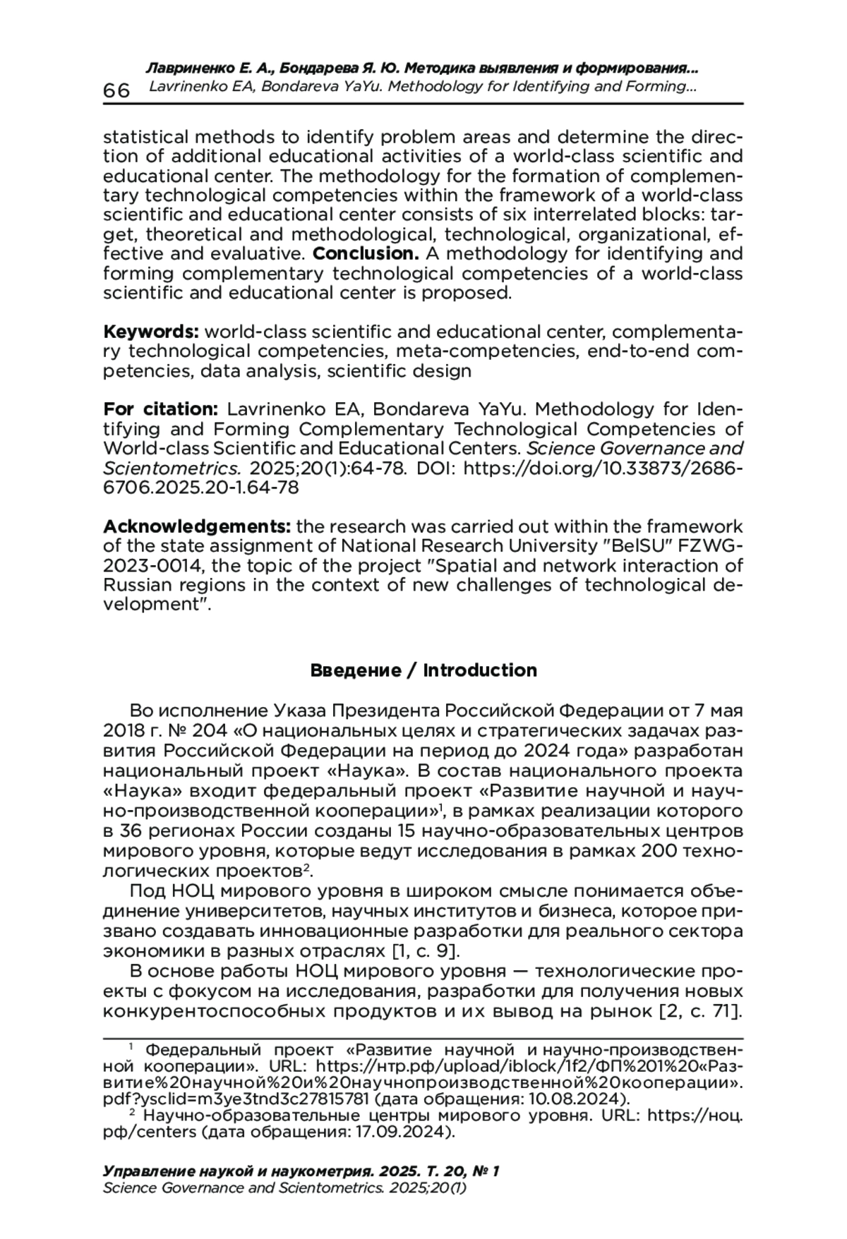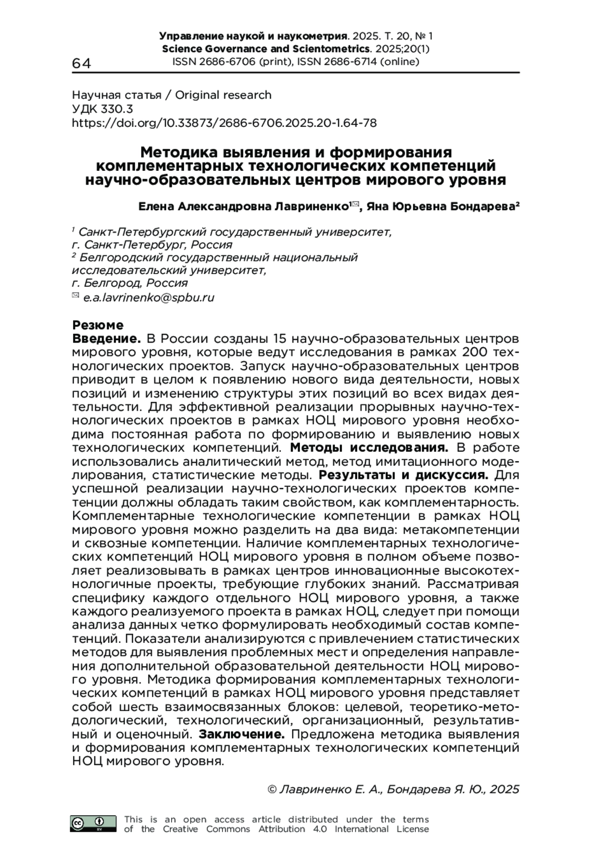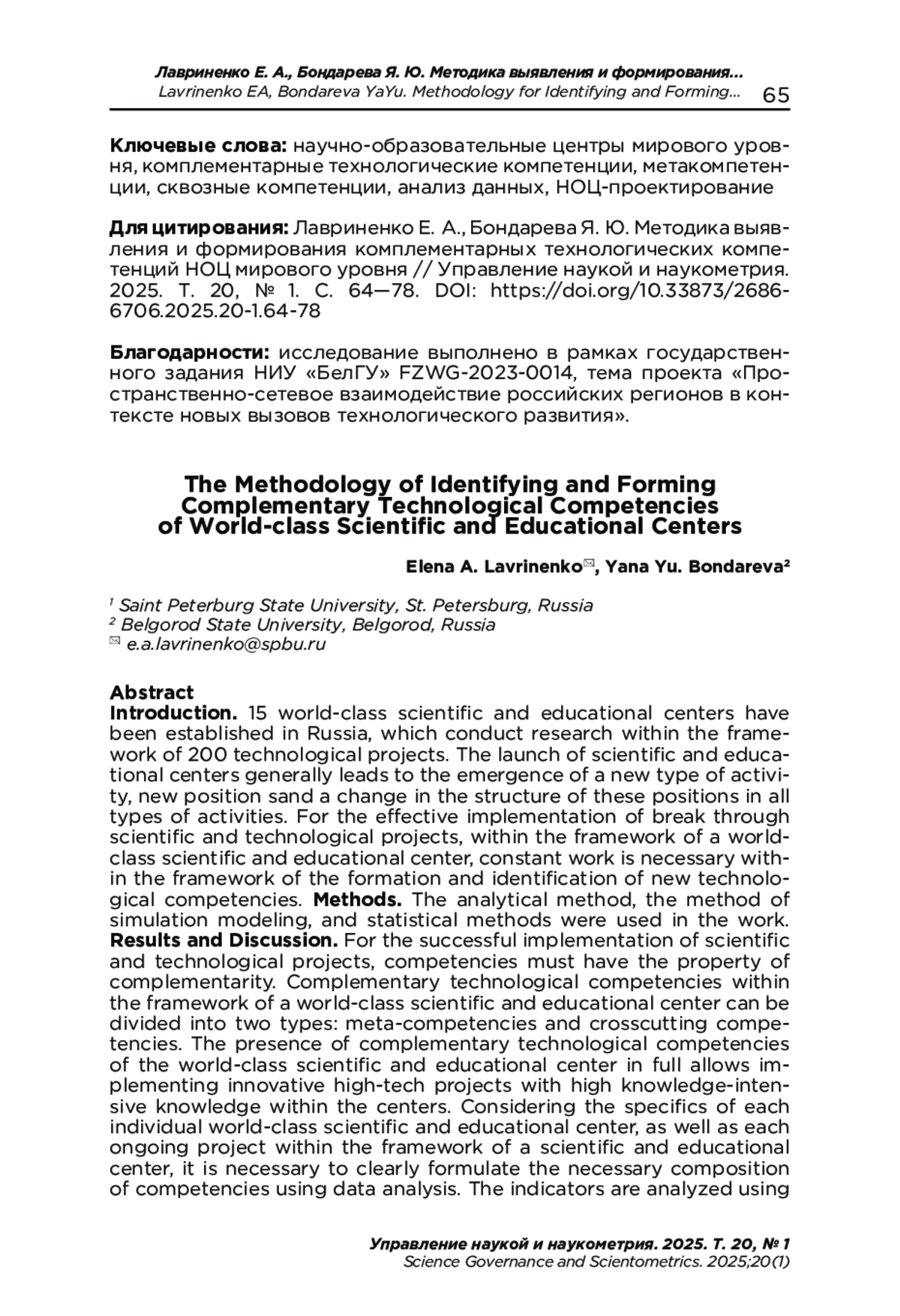 ЛАВРИНЕНКО Е. А., БОНДАРЕВА Я. Ю. МЕТОДИКА ВЫЯВЛЕНИЯ И ФОРМИРОВАНИЯ КОМПЛЕМЕНТАРНЫХ ТЕХНОЛОГИЧЕСКИХ КОМПЕТЕНЦИЙ НАУЧНО-ОБРАЗОВАТЕЛЬНЫХ ЦЕНТРОВ МИРОВОГО УРОВНЯ // УПРАВЛЕНИЕ НАУКОЙ И НАУКОМЕТРИЯ. 2025. Т. 20 № 1