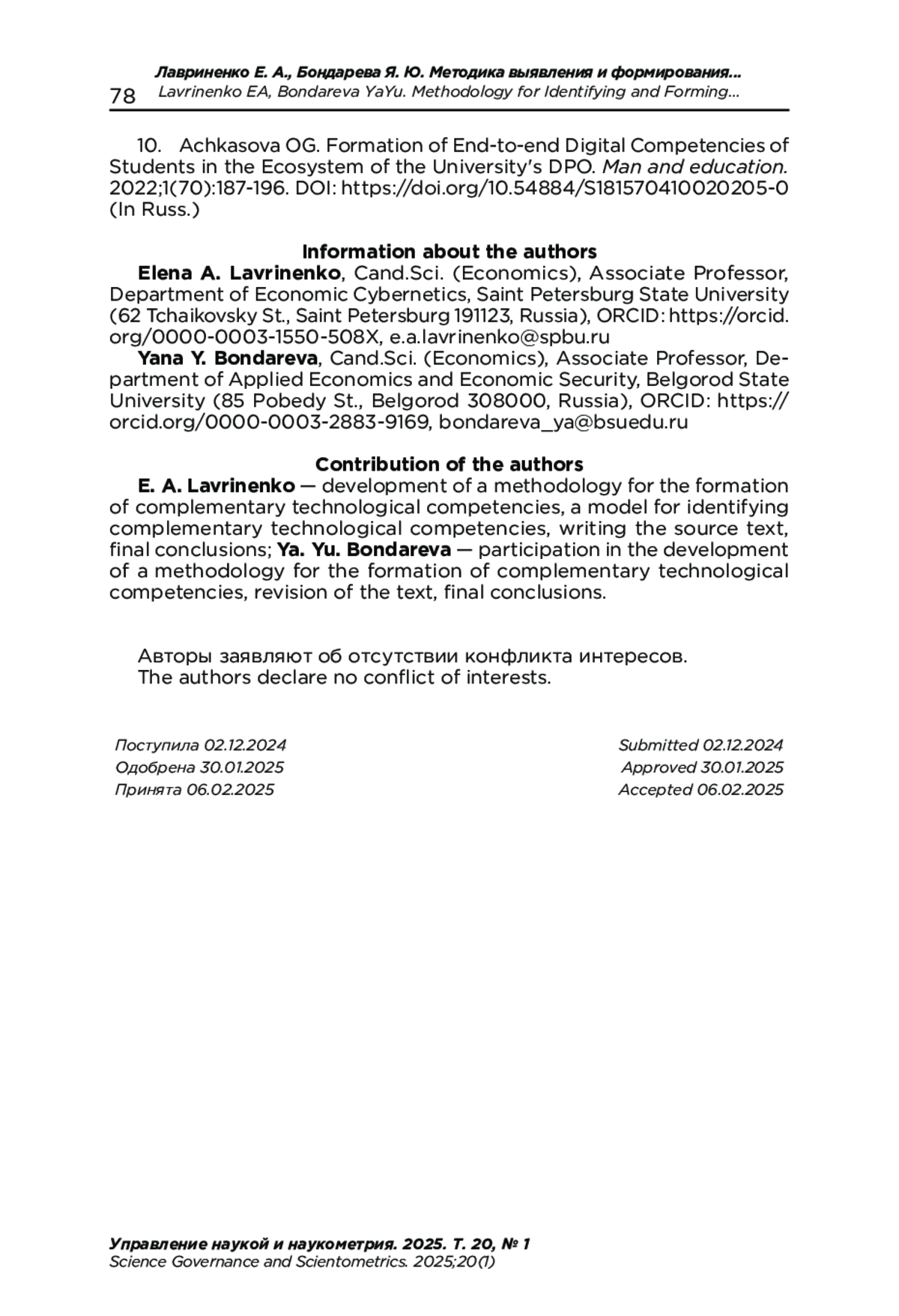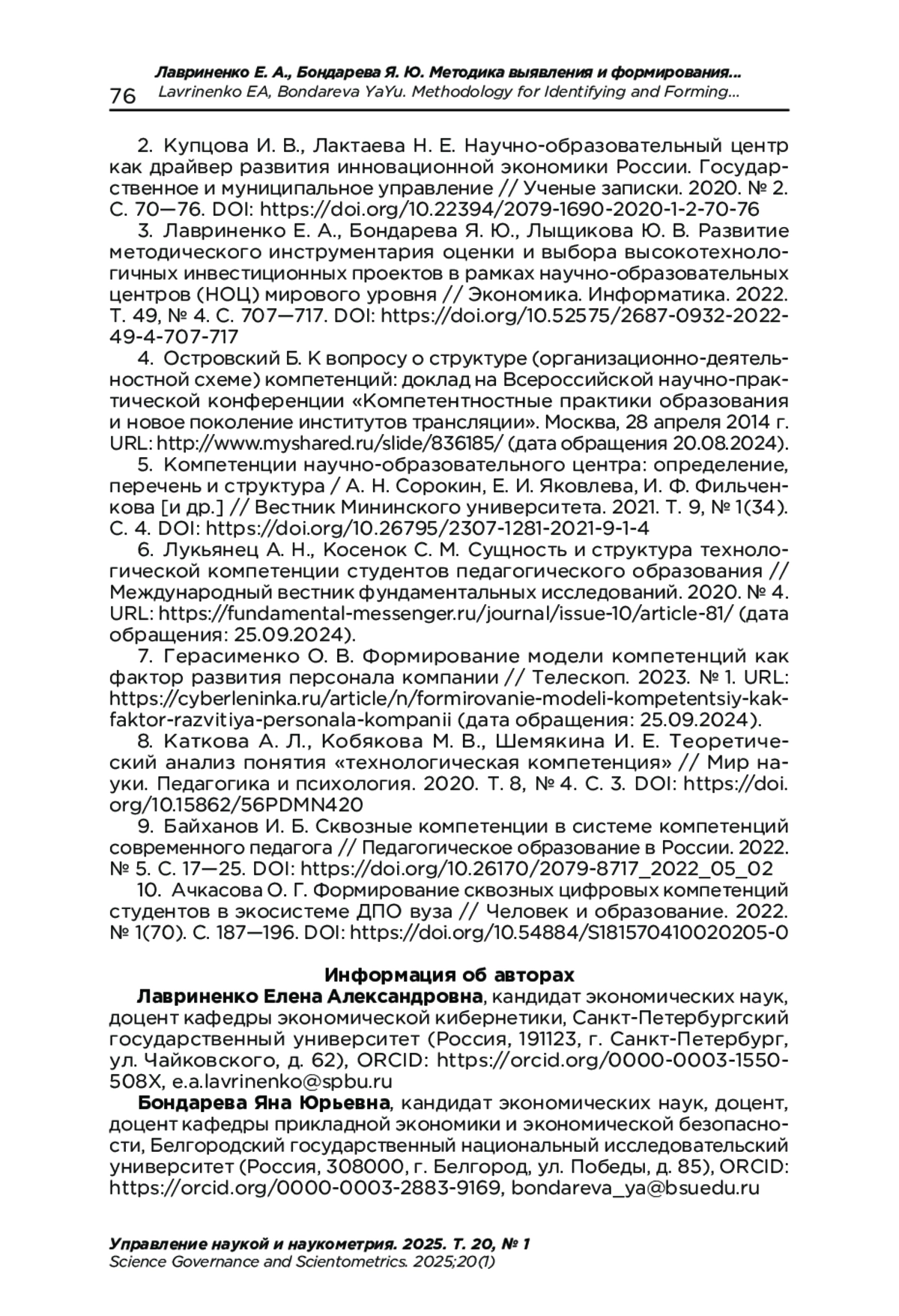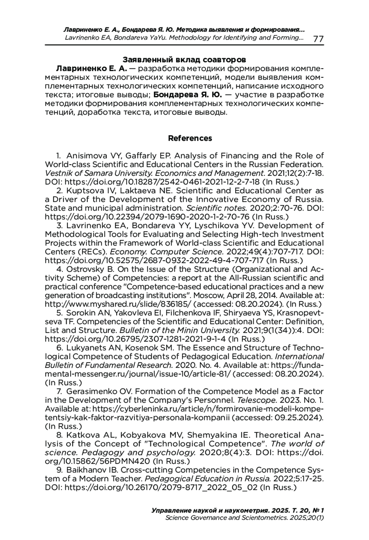 ЛАВРИНЕНКО Е. А., БОНДАРЕВА Я. Ю. МЕТОДИКА ВЫЯВЛЕНИЯ И ФОРМИРОВАНИЯ КОМПЛЕМЕНТАРНЫХ ТЕХНОЛОГИЧЕСКИХ КОМПЕТЕНЦИЙ НАУЧНО-ОБРАЗОВАТЕЛЬНЫХ ЦЕНТРОВ МИРОВОГО УРОВНЯ // УПРАВЛЕНИЕ НАУКОЙ И НАУКОМЕТРИЯ. 2025. Т. 20 № 1