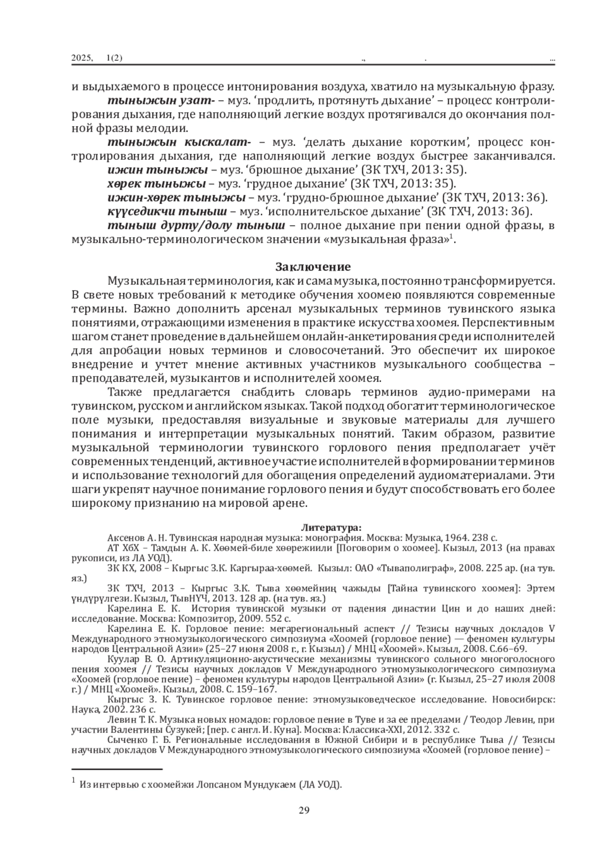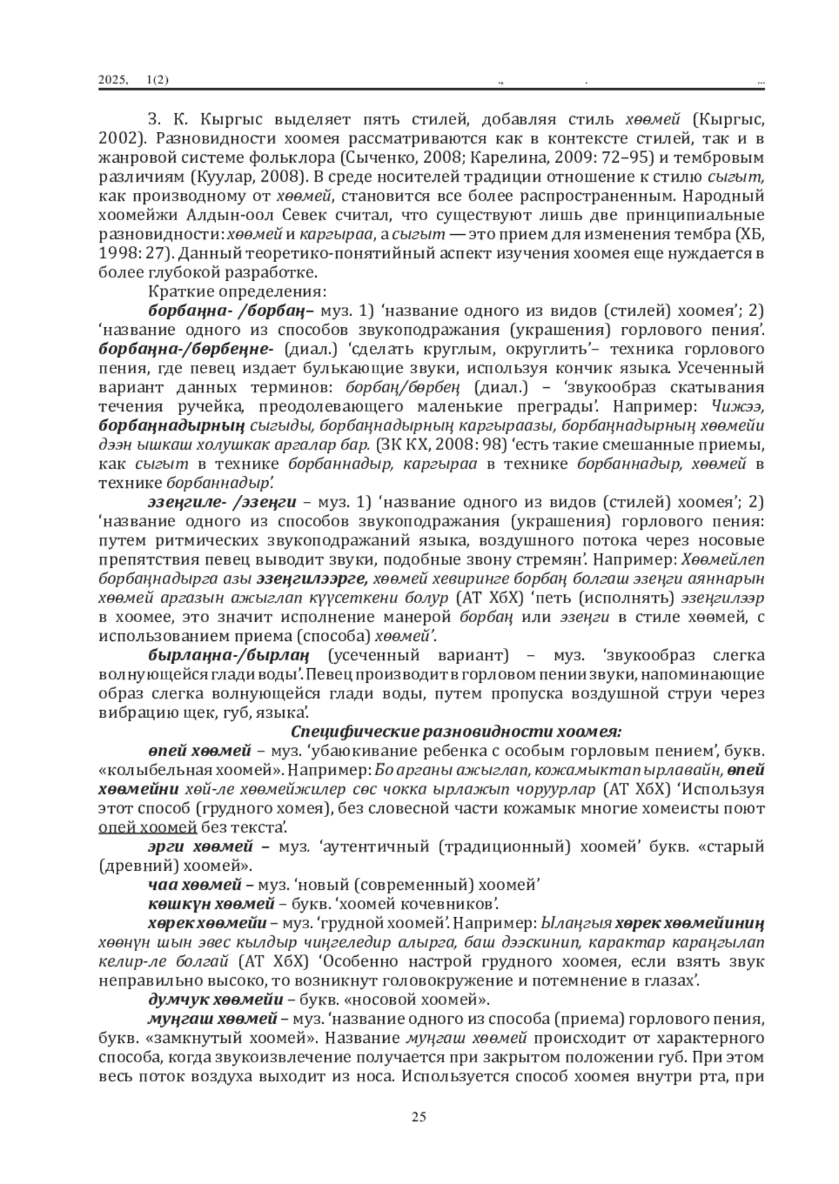 Дефиниция музыкальных терминов иногда подверженадескриптивному подходу, особенно в наименованиях инструментов, видов горлового пения и объяснениях заимствованных терминов. Словарные статьи не всегда содержат полныеэтимологические справки, сведения о времени фиксации висточниках и иллюстрации из художественной литературы исредств массовой информации. В первой части исследования(см. журнал за 2024 год) были представлены результаты по Первой группе терминов, обозначающих общее название горлового пения хоомей. Вовторой части исследования представлены результаты по группам терминов, обозначающих: разновидности горлового пения хоомей; специфические образовательные термины; иприемы корректировки дыхания во время исполнения хоомея.