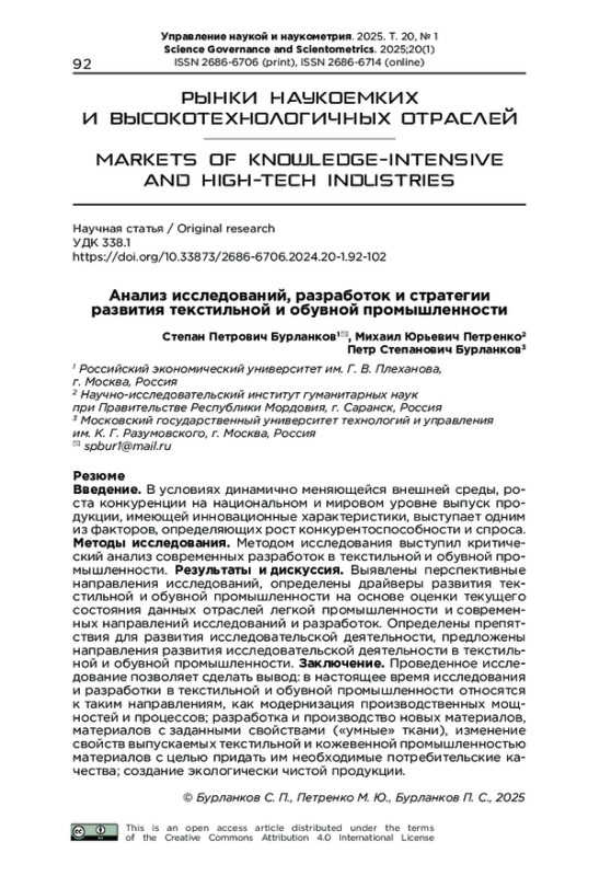 Заключение. Проведенное исследование позволяет сделать вывод: в настоящее время исследования и разработки в текстильной и обувной промышленности относятся к таким направлениям, как модернизация производственных мощностей и процессов; разработка и производство новых материалов, материалов с заданными свойствами («умные» ткани), изменение свойств выпускаемых текстильной и кожевенной промышленностью материалов с целью придать им необходимые потребительские качества; создание экологически чистой продукции.