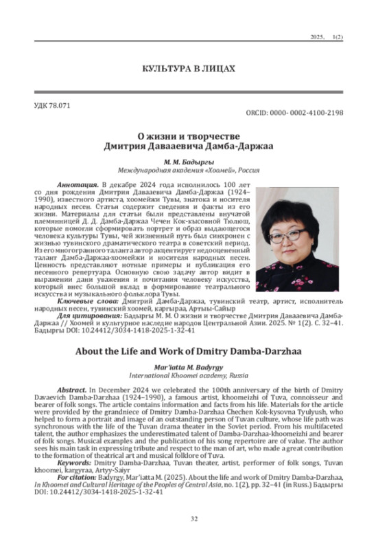 В декабре 2024 года исполнилось 100 лет со дня рождения Дмитрия Давааевича Дамба-Даржаа (1924– 1990), известного артиста, хоомейжи Тувы, знатока и носителя народных песен. Статья содержит сведения и факты из его жизни. Материалы для статьи были представлены внучатой племянницей Д. Д. Дамба-Даржаа Чечен Кок-кысовной Тюлюш, которые помогли сформировать портрет и образ выдающегося человека культуры Тувы, чей жизненный путь был синхронен с жизнью тувинского драматического театра в советский период. Из его многогранного таланта автор акцентирует недооцененный талант Дамба-Даржаа-хоомейжи и носителя народных песен. Ценность представляют нотные примеры и публикация его песенного репертуара. Основную свою задачу автор видит в выражении дани уважения и почитания человеку искусства, который внес большой вклад в формирование театрального искусства и музыкального фольклора Тувы/