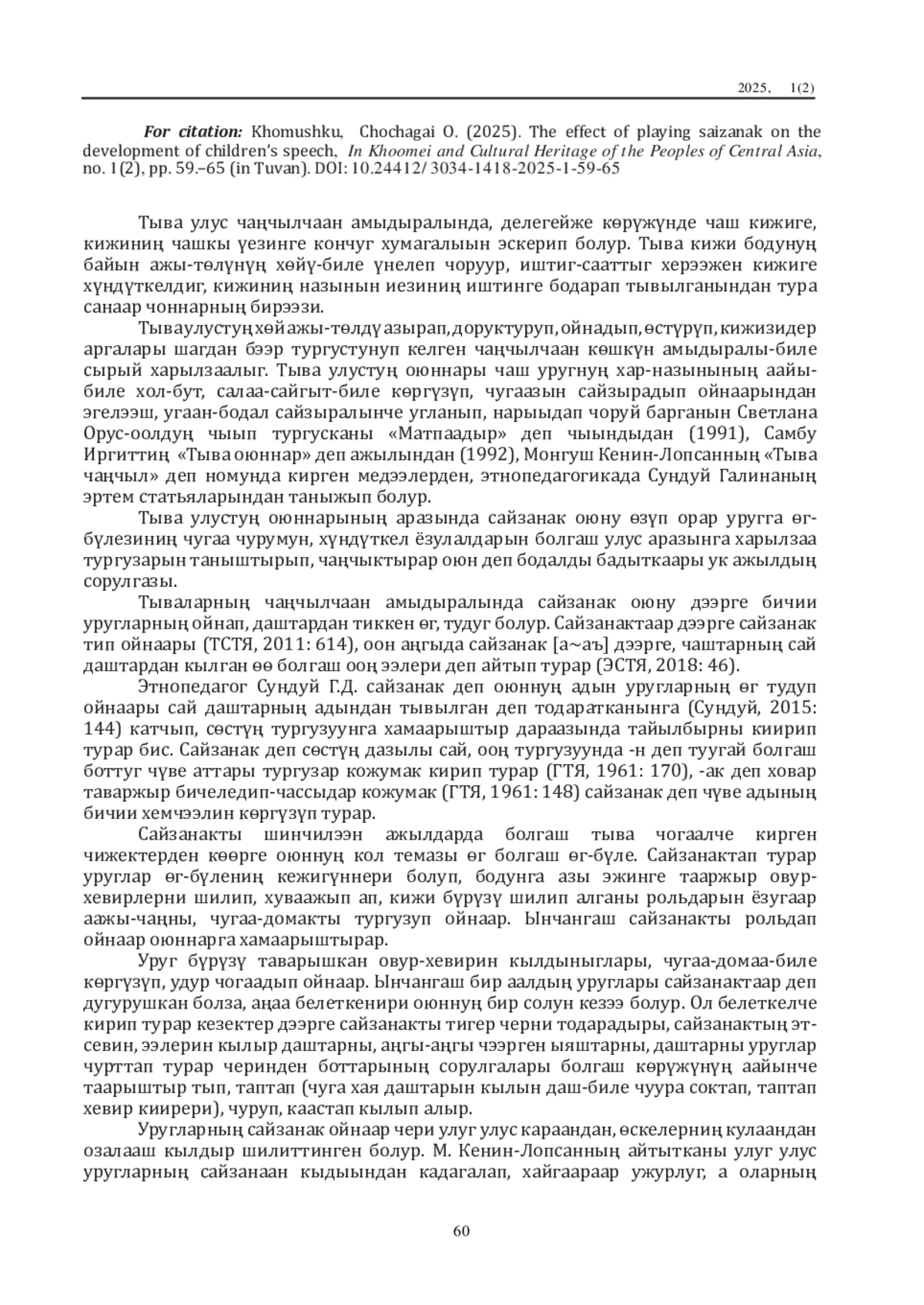 4. Мендот Эл. Э., Мендот И. Э., Мендот Эм. Э., Монгуш В. Б. Игра “Сайзанак” детей кочевого народа // Педагогико-психологические и медико-биологические проблемы физической культуры и спорта. 2022. №17(2). С. 154-160. DOI: 10.14526/2070-4798-2022-17-2-154-160 EDN: GKQWRK