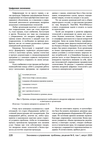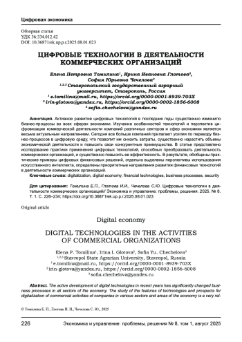 ТОМИЛИНА Е. П., ГЛОТОВА И. И., ЧЕЧЕЛОВА С. Ю. ЦИФРОВЫЕ ТЕХНОЛОГИИ В ДЕЯТЕЛЬНОСТИ КОММЕРЧЕСКИХ ОРГАНИЗАЦИЙ // ЭКОНОМИКА И УПРАВЛЕНИЕ: ПРОБЛЕМЫ, РЕШЕНИЯ. 2025. ТОМ 1 № 8