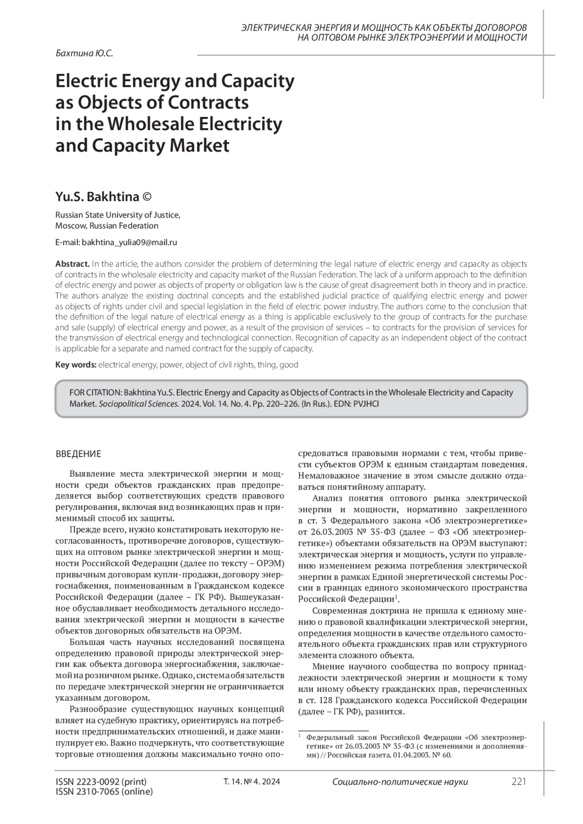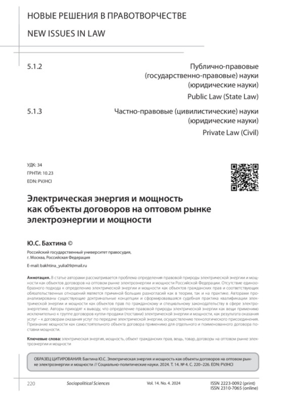 В статье авторами рассматривается проблема определения правовой природы электрической энергии и мощности как объектов договоров на оптовом рынке электроэнергии и мощности Российской Федерации. Отсутствие единообразного подхода к определению электрической энергии и мощности как объектов гражданских прав и соответствующих обязательственных отношений является причиной больших разногласий как в теории, так и на практике. Авторами проанализированы существующие доктринальные концепции и сформировавшаяся судебная практика квалификации электрической энергии и мощности как объектов прав по гражданскому и специальному законодательству в сфере электроэнергетике. Авторы приходят к выводу, что определение правовой природы электрической энергии как вещи применимо исключительно к группе договоров купли-продажи (поставки) электрической энергии и мощности, как результата оказания услуг - к договорам оказания услуг по передаче электрической энергии, осуществлению технологического присоединения. Признание мощности как самостоятельного объекта договора применимо для отдельного и поименованного договора поставки мощности.