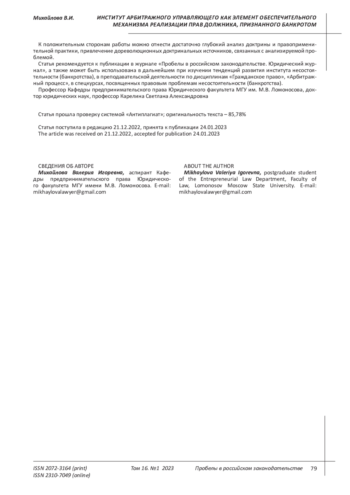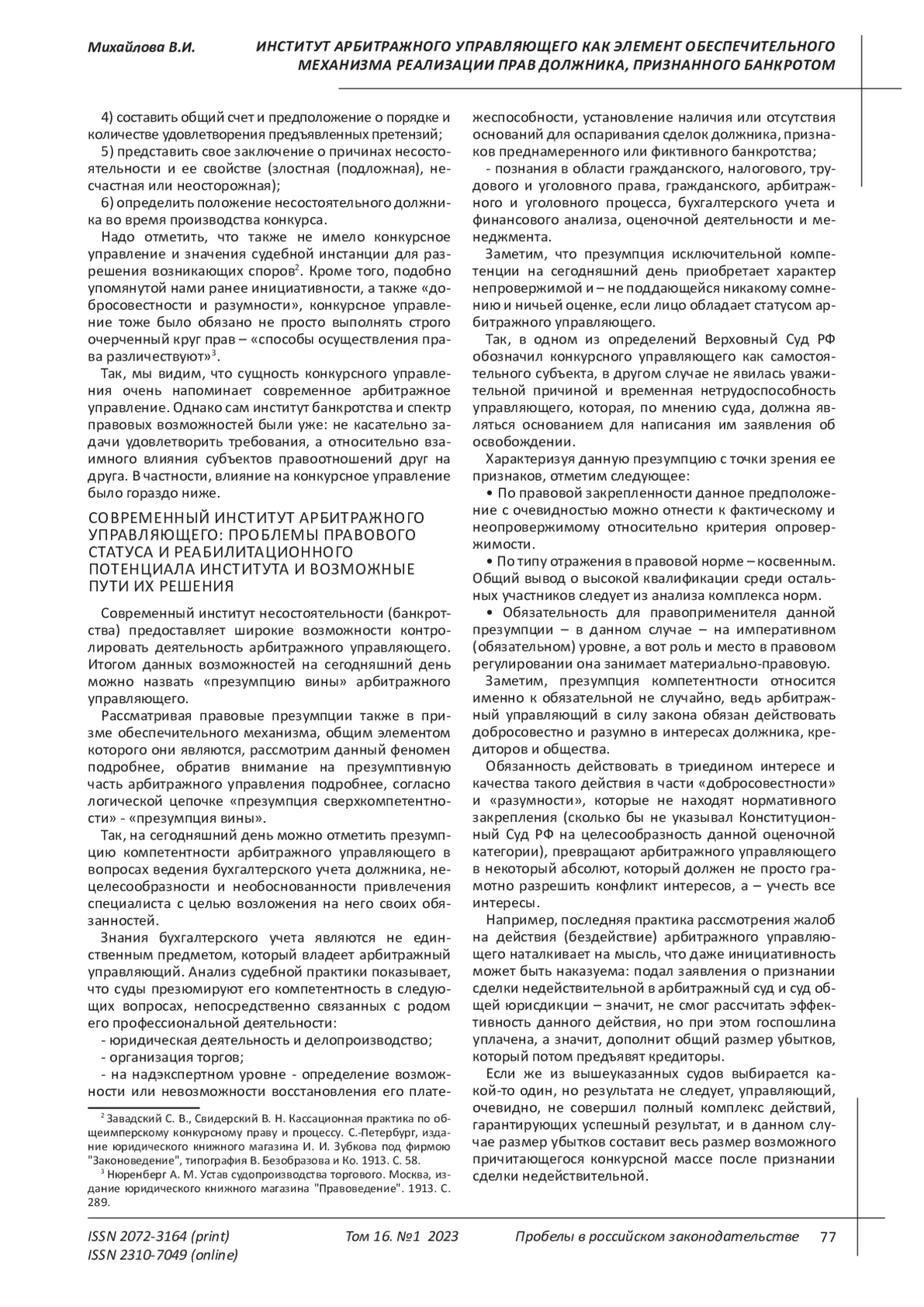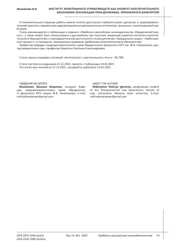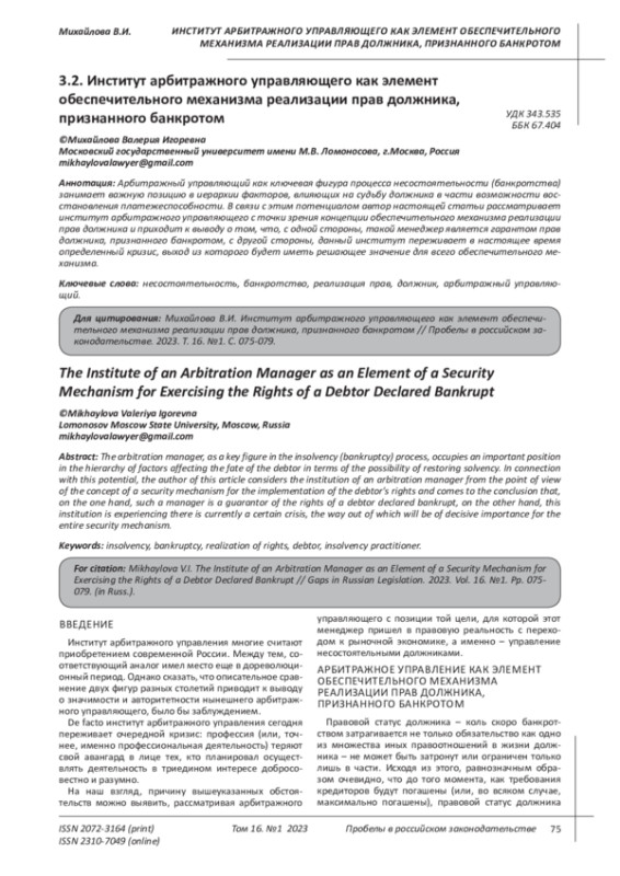 МИХАЙЛОВА В. И. ИНСТИТУТ АРБИТРАЖНОГО УПРАВЛЯЮЩЕГО КАК ЭЛЕМЕНТ ОБЕСПЕЧИТЕЛЬНОГО МЕХАНИЗМА РЕАЛИЗАЦИИ ПРАВ ДОЛЖНИКА, ПРИЗНАННОГО БАНКРОТОМ // ПРОБЕЛЫ В РОССИЙСКОМ ЗАКОНОДАТЕЛЬСТВЕ. 2023. Т. 16 № 1