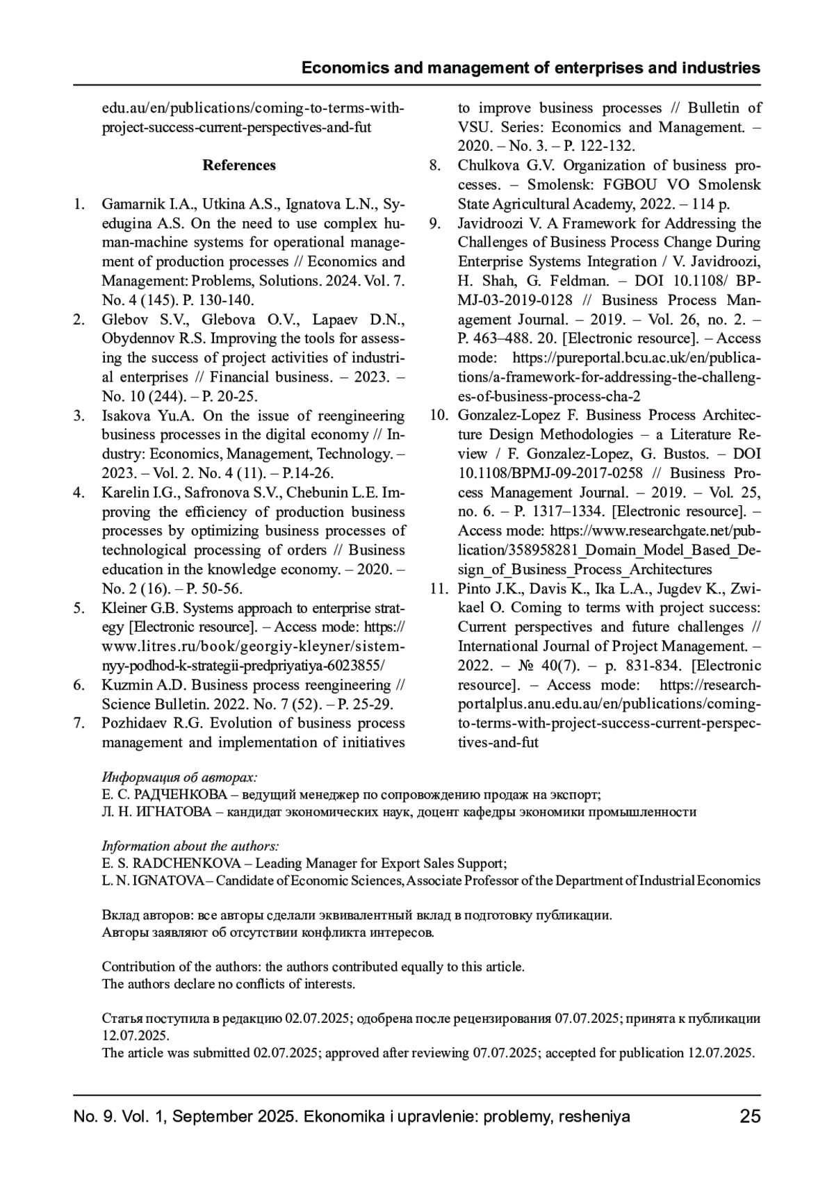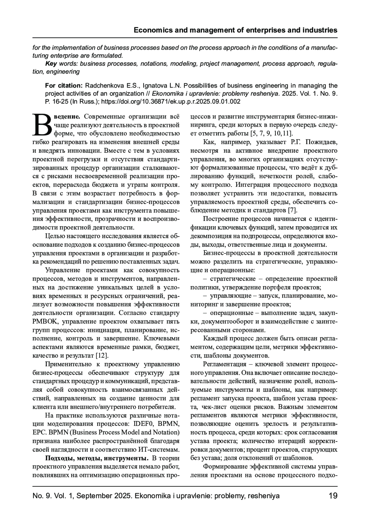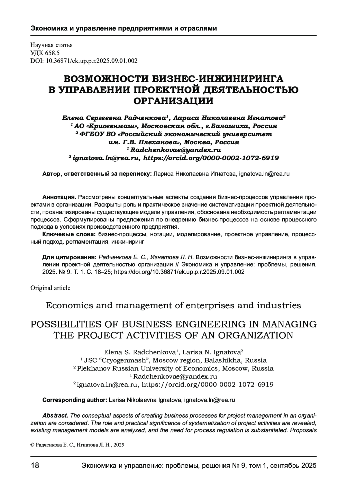 РАДЧЕНКОВА Е. С., ИГНАТОВА Л. Н. ВОЗМОЖНОСТИ БИЗНЕС-ИНЖИНИРИНГА В УПРАВЛЕНИИ ПРОЕКТНОЙ ДЕЯТЕЛЬНОСТЬЮ ОРГАНИЗАЦИИ // ЭКОНОМИКА И УПРАВЛЕНИЕ: ПРОБЛЕМЫ, РЕШЕНИЯ. 2025. ТОМ 1 № 9