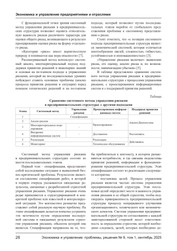 В статье обоснован системный метод управления рисками в предпринимательских структурах, который позволяет выявить и оценить общий риск, который несет предпринимательская структура, а также определить стратегические цели для эффективного управления рисками. Выявлено, что системный метод управления рисками в предпринимательских структурах можно представить как формализованный подход к современному управлению рисками. Научная новизна и практическая значимость работы заключается в обосновании рассматриваемого подхода, который основан на использовании системно-организованного метода анализа рисков и многокритериального метода поддержки принятия управленческих решений. Основные методы управления рисками, разработанные до настоящего времени, основаны на индивидуальном анализе и управлении рисками, а предлагаемый метод является расширением этих методов в направлении комплексного управления, сочетающего анализ и управление рисками и является признаком приверженности устойчивому развитию, разделяемой всеми подразделениями предпринимательской структуры.