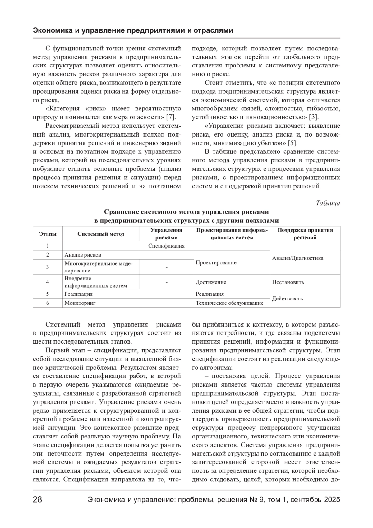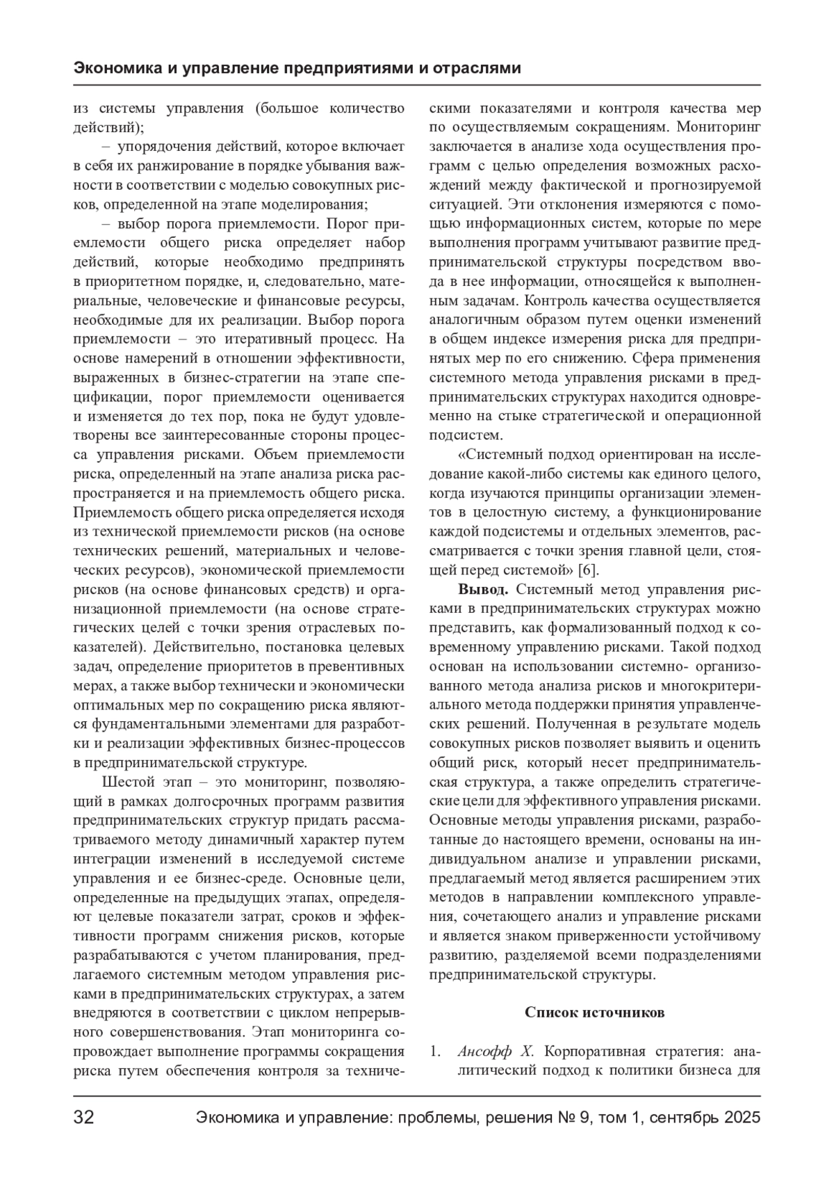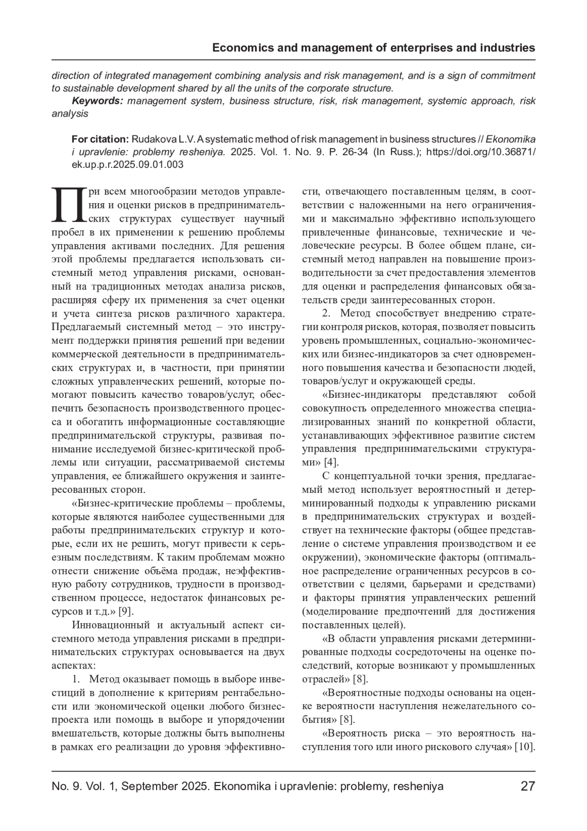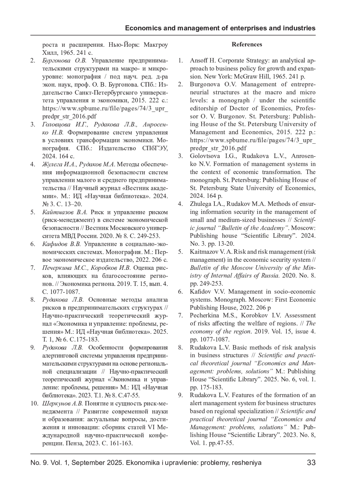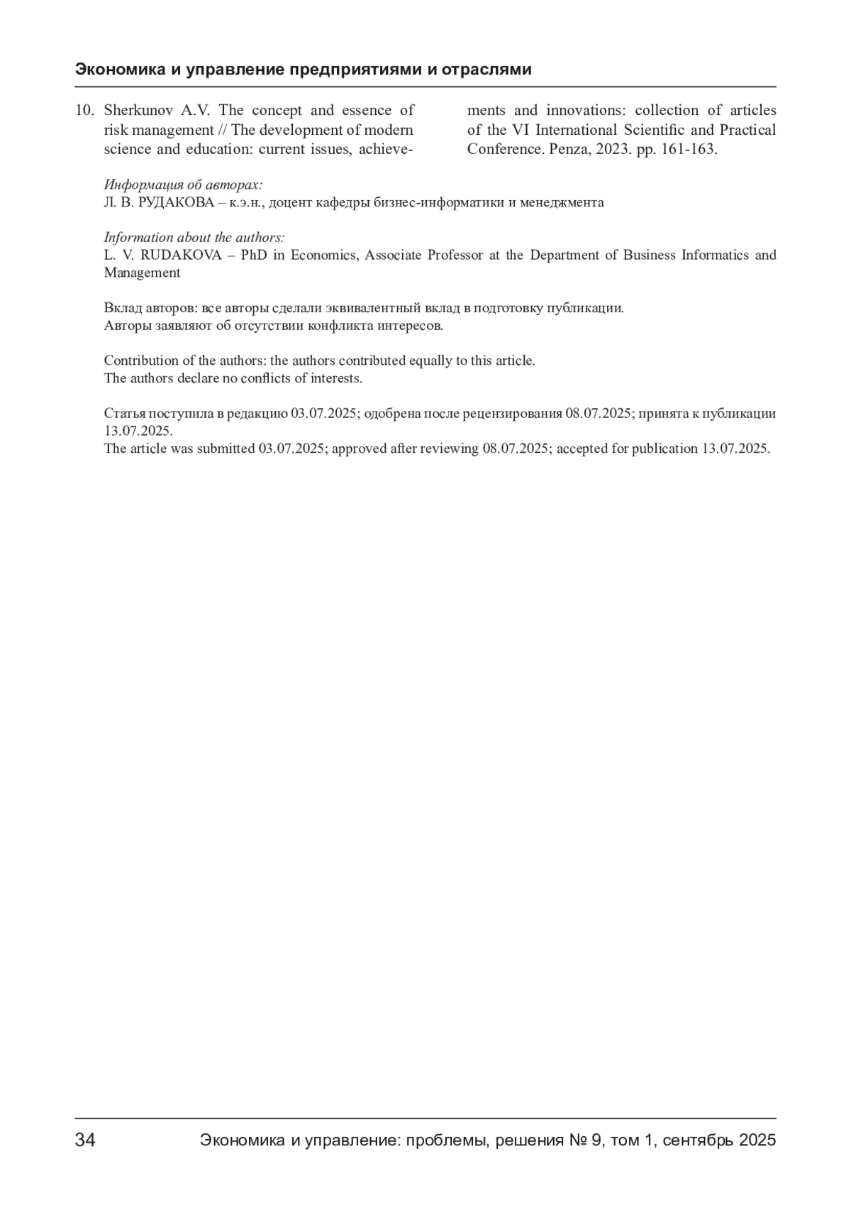 8. Рудакова Л.В. Основные методы анализа рисков в предпринимательских структурах // Научно-практический теоретический журнал “Экономика и управление: проблемы, решения” М.: ИД “Научная библиотека”. 2025. Т. 1, № 6. С.175-183.