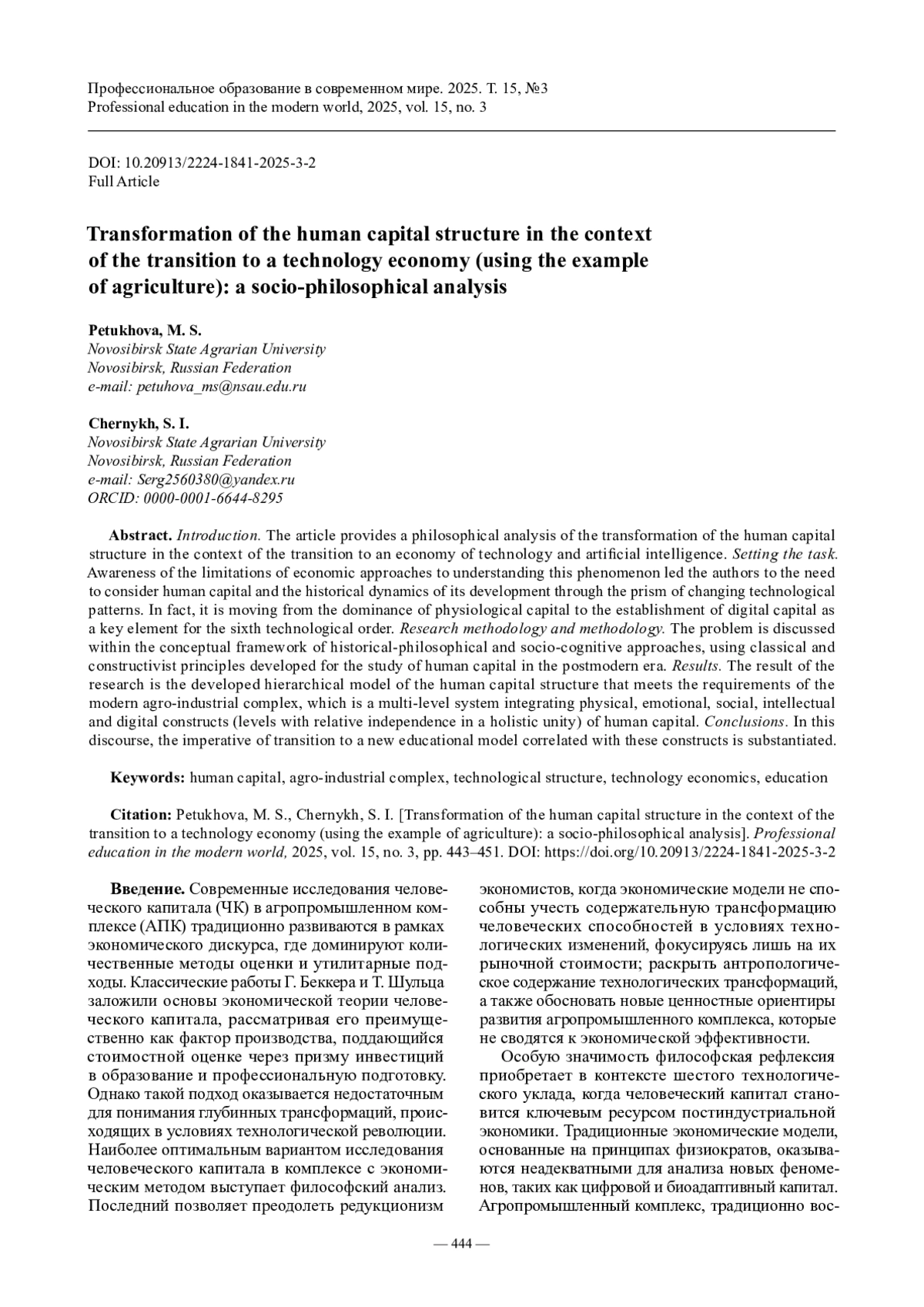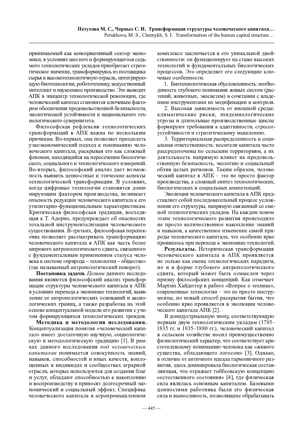 Современный этап, соответствующий шестому технологическому укладу (с 2010-х гг.), характеризуется окончательным становлением экономики технологий в АПК. Искусственный интеллект, интернет вещей, технологии точного земледелия, геномное редактирование – все это превращает цифровой капитал в ключевой компонент человеческого капитала.