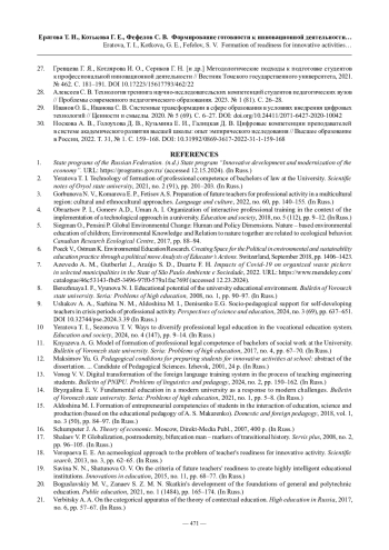 27. Гревцева Г. Я., Котлярова И. О., Сериков Г. Н. [и др.] Методологические подходы к подготовке студентов к профессиональной инновационной деятельности // Вестник Томского государственного университета, 2021. № 462. С. 181-191. https://doi.org/10.17223/15617793/462/22