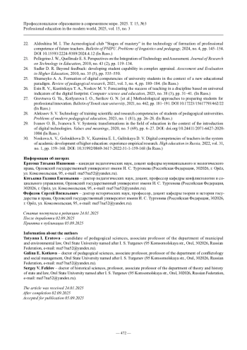2. Ератова Т. И. Технология формирования профессиональной компетентности бакалавров юриспруденции в университете // Ученые записки Орловского государственного университета. 2021. № 2(91). С. 201-203.