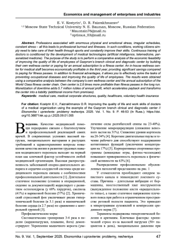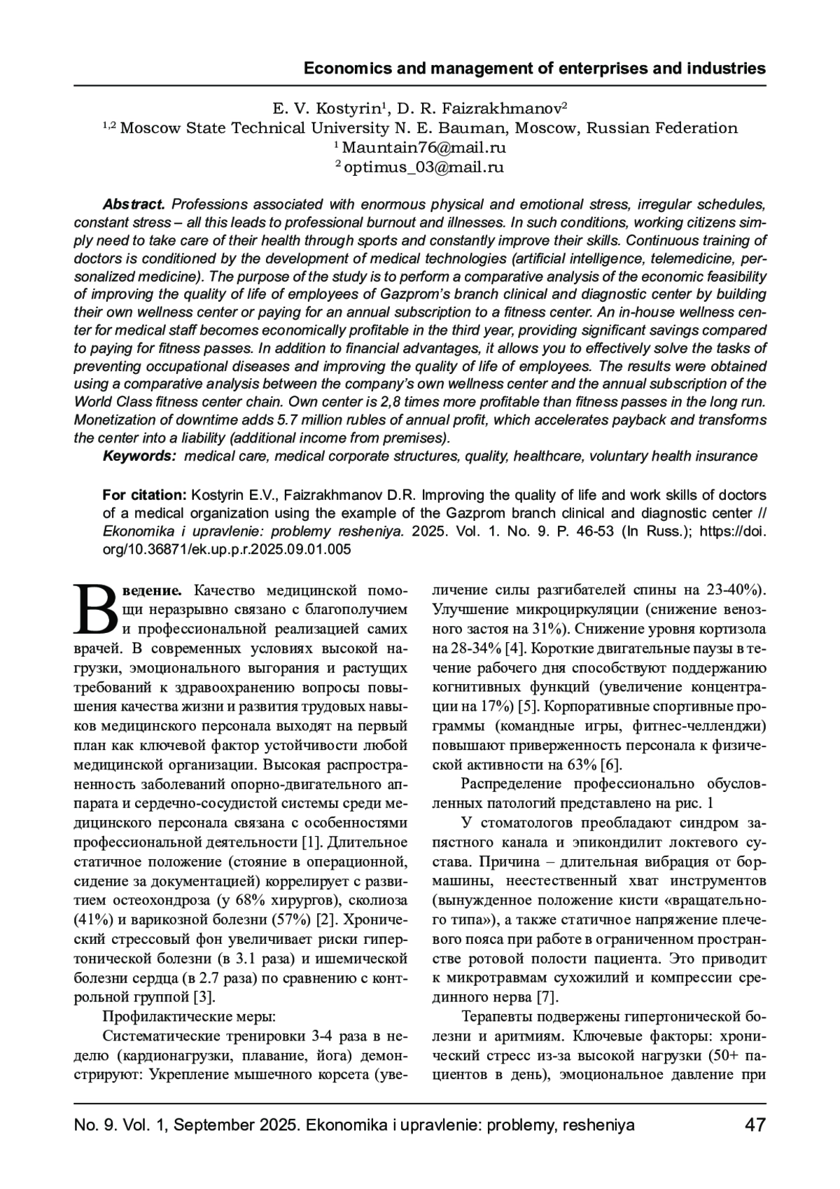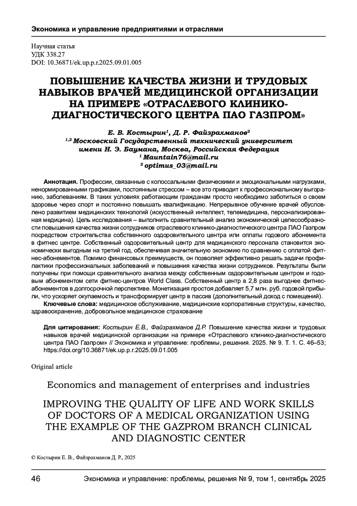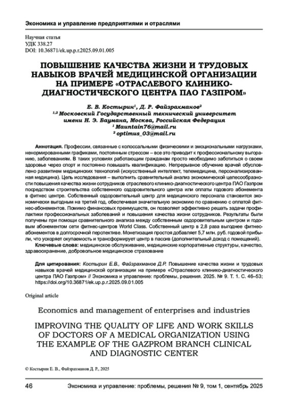 Цель исследования - выполнить сравнительный анализ экономической целесообразности повышения качества жизни сотрудников отраслевого клинико-диагностического центра ПАО Газпром посредством строительства собственного оздоровительного центра или оплаты годового абонемента в фитнес центре. Собственный оздоровительный центр для медицинского персонала становится экономически выгодным на третий год, обеспечивая значительную экономию по сравнению с оплатой фитнес-абонементов. Помимо финансовых преимуществ, он позволяет эффективно решать задачи профилактики профессиональных заболеваний и повышения качества жизни сотрудников. Результаты были получены при помощи сравнительного анализа между собственным оздоровительным центром и годовым абонементом сети фитнес-центров World Class. Собственный центр в 2,8 раза выгоднее фитнесабонементов в долгосрочной перспективе. Монетизация простоя добавляет 5,7 млн. руб. годовой прибыли, что ускоряет окупаемость и трансформирует центр в пассив (дополнительный доход с помещений).