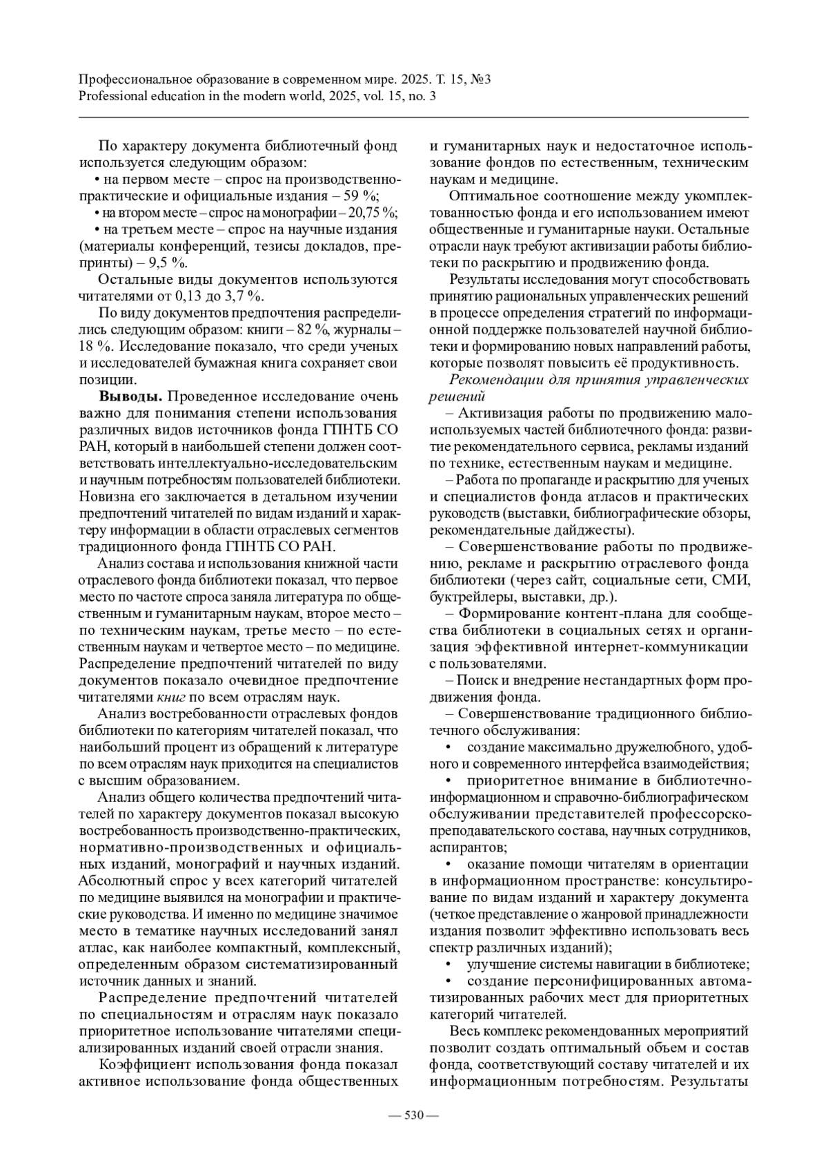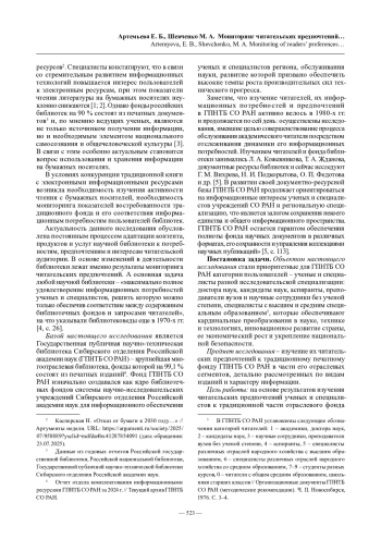Введение. Мониторинг читательских предпочтений является необходимым условием повышения эффективности деятельности библиотеки. Актуальность исследования обусловлена постоянным процессом адаптации контента, продуктов и услуг научной библиотеки к потребностям, предпочтениям и интересам читательской аудитории.