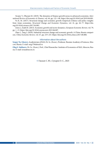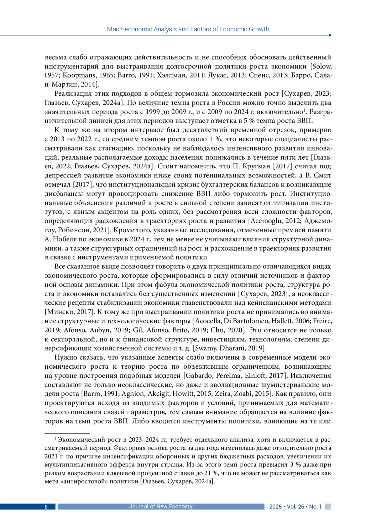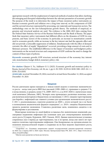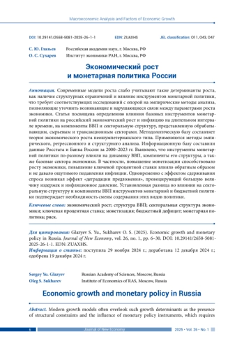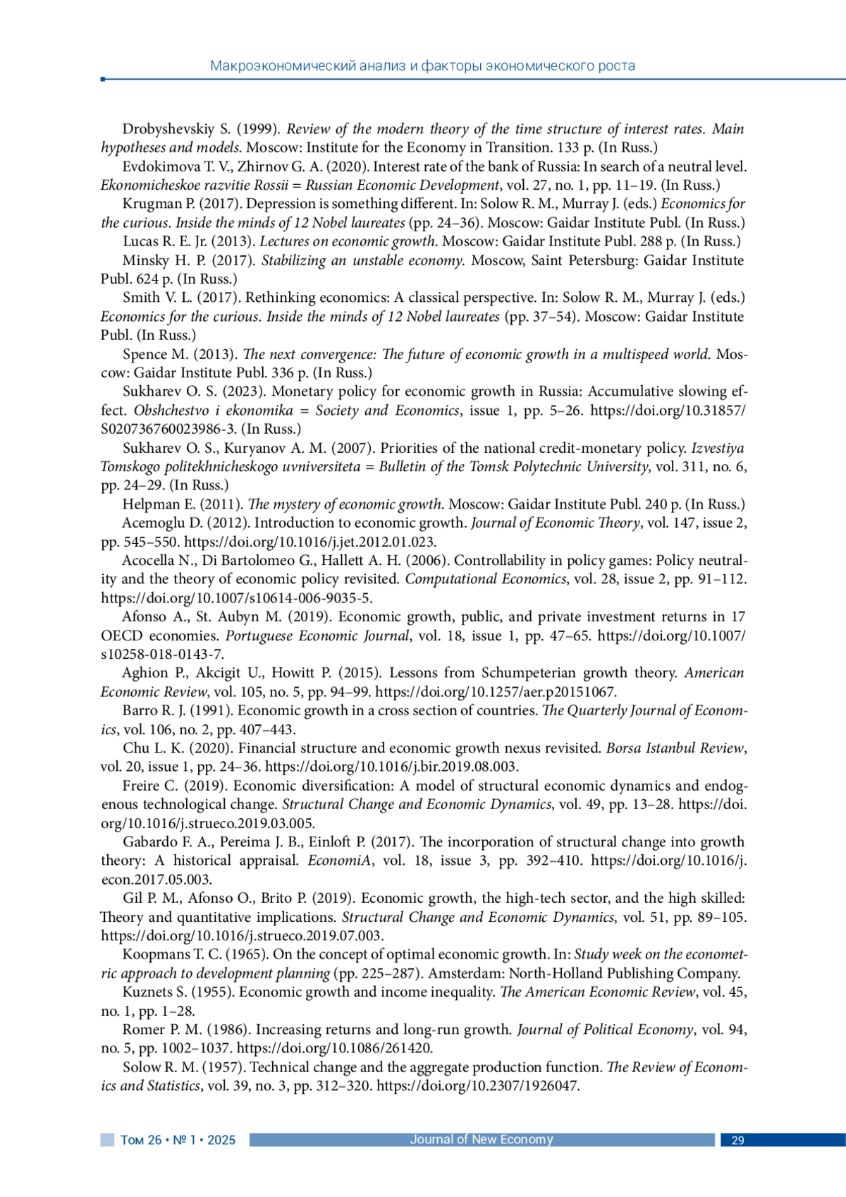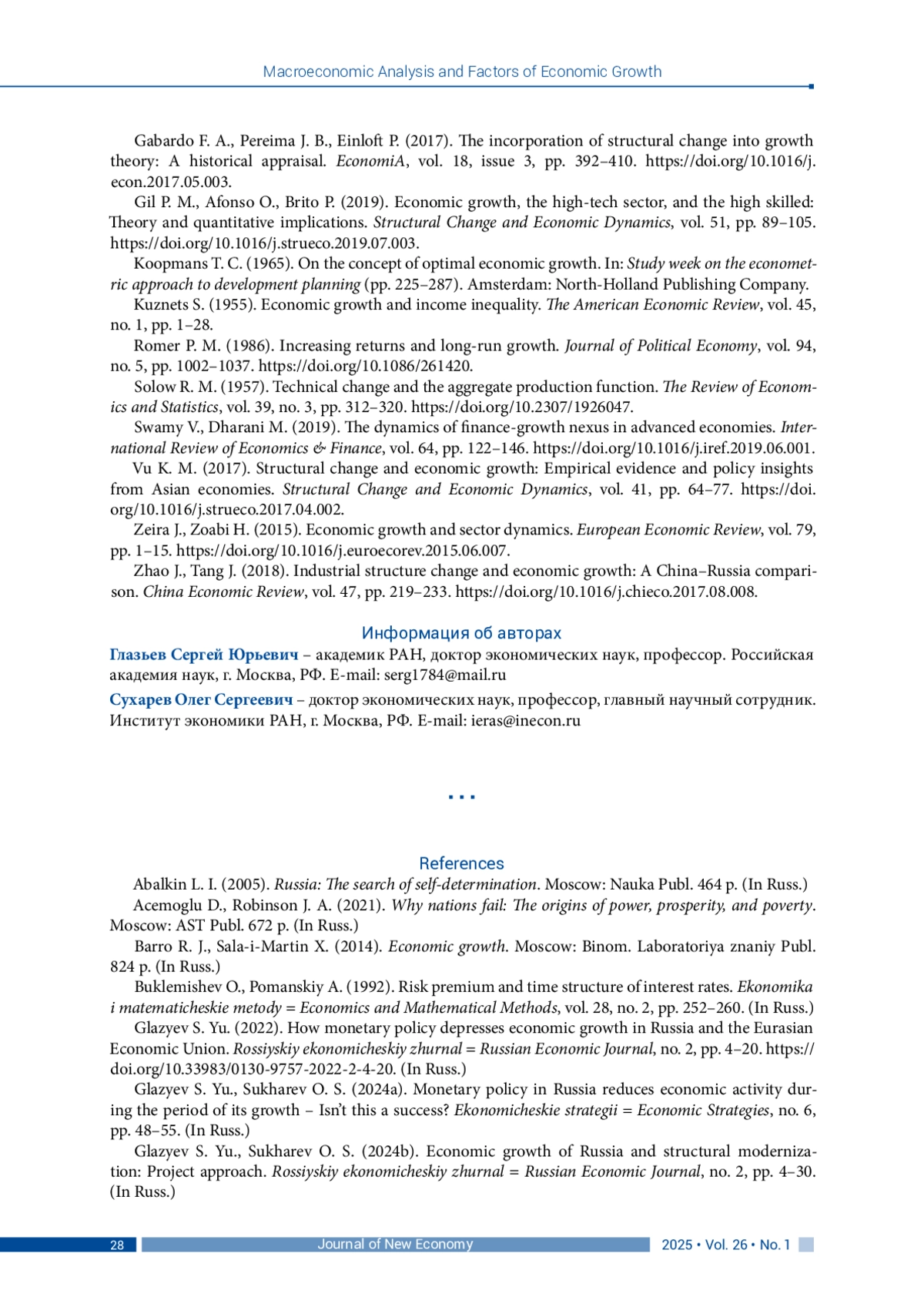 ГЛАЗЬЕВ С. Ю., СУХАРЕВ О. С. ЭКОНОМИЧЕСКИЙ РОСТ И МОНЕТАРНАЯ ПОЛИТИКА РОССИИ // JOURNAL OF NEW ECONOMY. 2025. Т. 26 № 1
