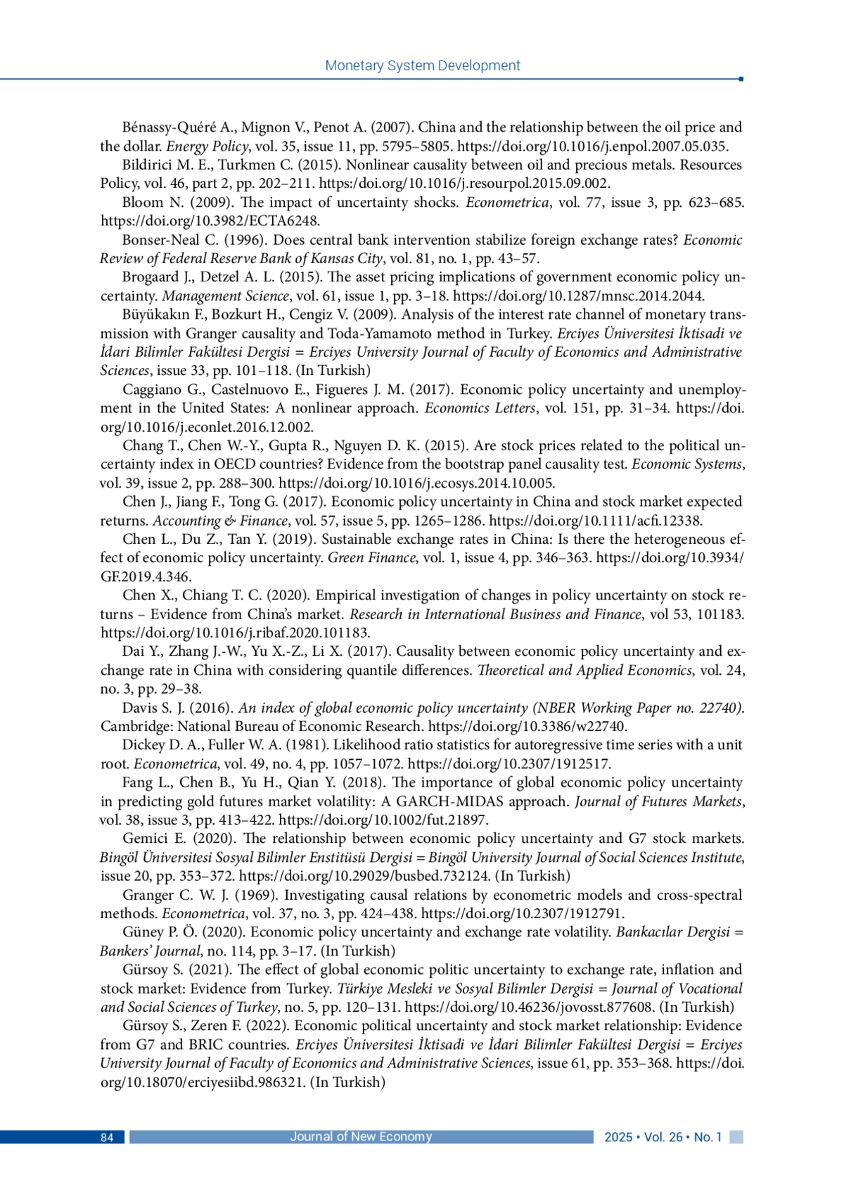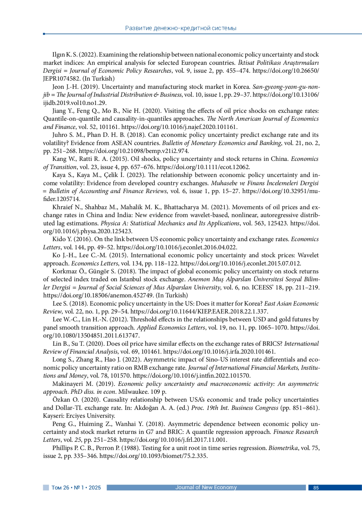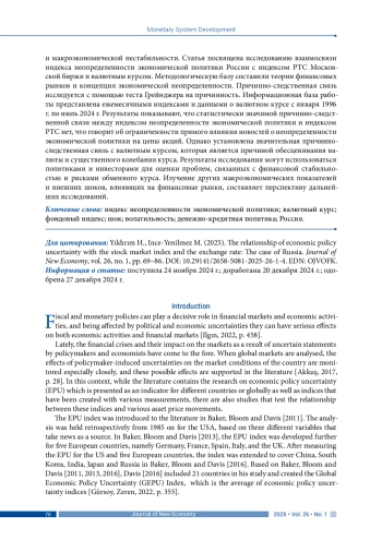 YILDIRIM H., INCE-YENILMEZ M. THE RELATIONSHIP OF ECONOMIC POLICY UNCERTAINTY WITH THE STOCK MARKET INDEX AND THE EXCHANGE RATE: THE CASE OF RUSSIA // JOURNAL OF NEW ECONOMY. 2025. Т. 26 № 1