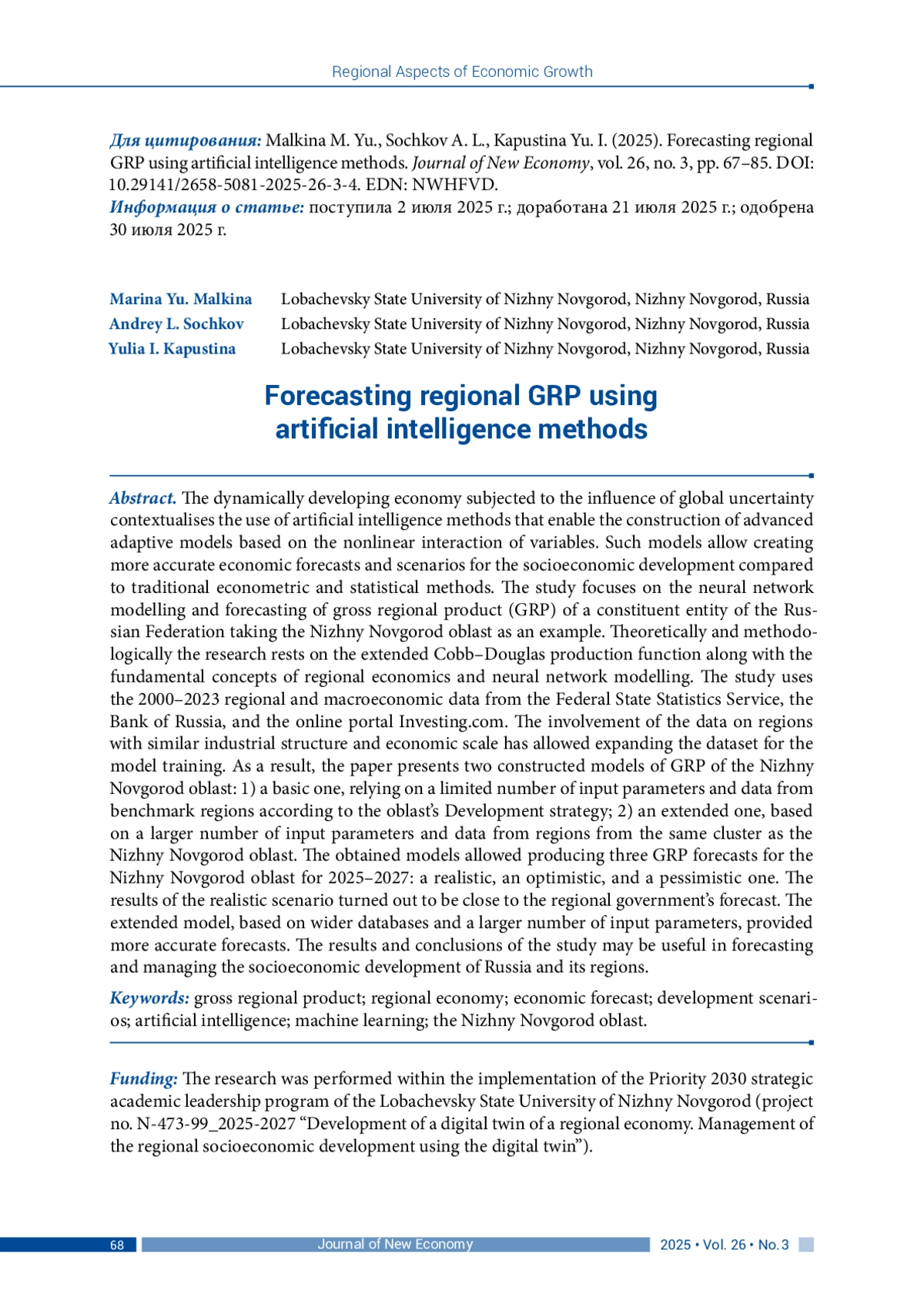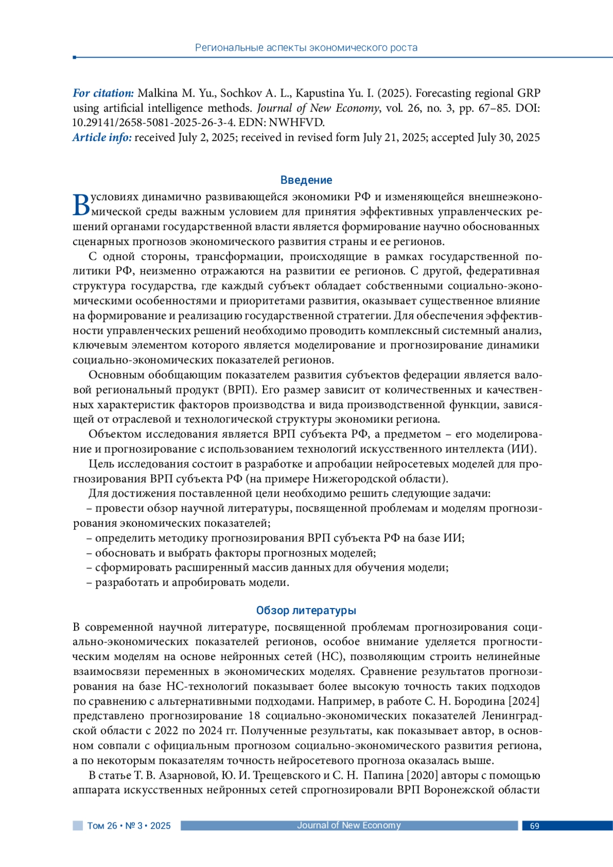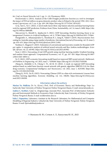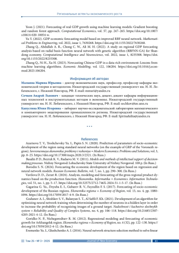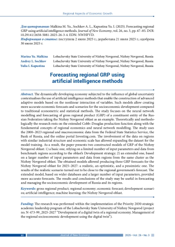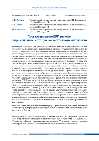 МАЛКИНА М. Ю., СОЧКОВ А. Л., КАПУСТИНА Ю. И. ПРОГНОЗИРОВАНИЕ ВРП РЕГИОНА С ПРИМЕНЕНИЕМ МЕТОДОВ ИСКУССТВЕННОГО ИНТЕЛЛЕКТА // JOURNAL OF NEW ECONOMY. 2025. Т. 26 № 3