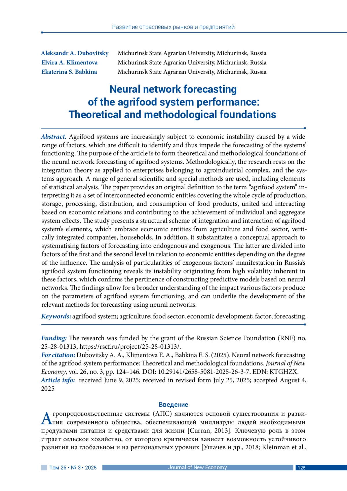 6. Дубовицкий А. А., Климентова Э. А. (2024). Прогнозирование агропродовольственных экономических систем с использованием искусственных нейронных сетей // Аграрный вестник Урала. Т. 24, № 8. С. 1093-1105. DOI: 10.32417/1997-4868-2024-24-08-1093-1105 EDN: PAIKIT