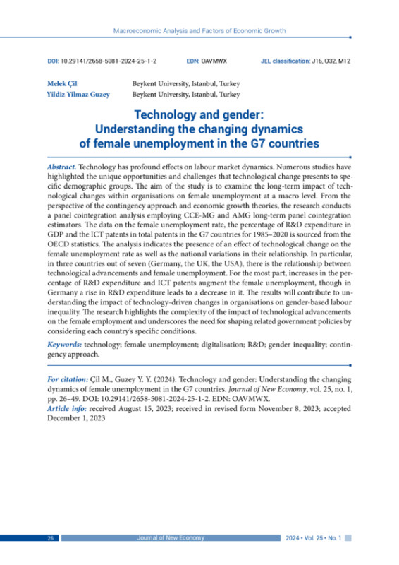 Technology has profound effects on labour market dynamics. Numerous studies have highlighted the unique opportunities and challenges that technological change presents to specific demographic groups. The aim of the study is to examine the long-term impact of technological changes within organisations on female unemployment at a macro level. From the perspective of the contingency approach and economic growth theories, the research conducts a panel cointegration analysis employing CCE-MG and AMG long-term panel cointegration estimators. The data on the female unemployment rate, the percentage of R&D expenditure in GDP and the ICT patents in total patents in the G7 countries for 1985–2020 is sourced from the OECD statistics. The analysis indicates the presence of an effect of technological change on the female unemployment rate as well as the national variations in their relationship. In particular, in three countries out of seven (Germany, the UK, the USA), there is the relationship between technological advancements and female unemployment. For the most part, increases in the percentage of R&D expenditure and ICT patents augment the female unemployment, though in Germany a rise in R&D expenditure leads to a decrease in it. The results will contribute to understanding the impact of technology-driven changes in organisations on gender-based labour inequality. The research highlights the complexity of the impact of technological advancements on the female employment and underscores the need for shaping related government policies by considering each country’s specific conditions