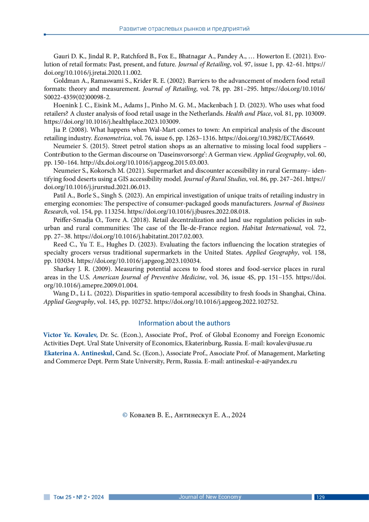 КОВАЛЕВ В. Е., АНТИНЕСКУЛ Е. А. ПРОДОВОЛЬСТВЕННЫЙ РИТЕЙЛ В СЕЛЬСКОЙ МЕСТНОСТИ: ВЫБОР ОПТИМАЛЬНОГО ФОРМАТА // JOURNAL OF NEW ECONOMY. 2024. Т. 25 № 2