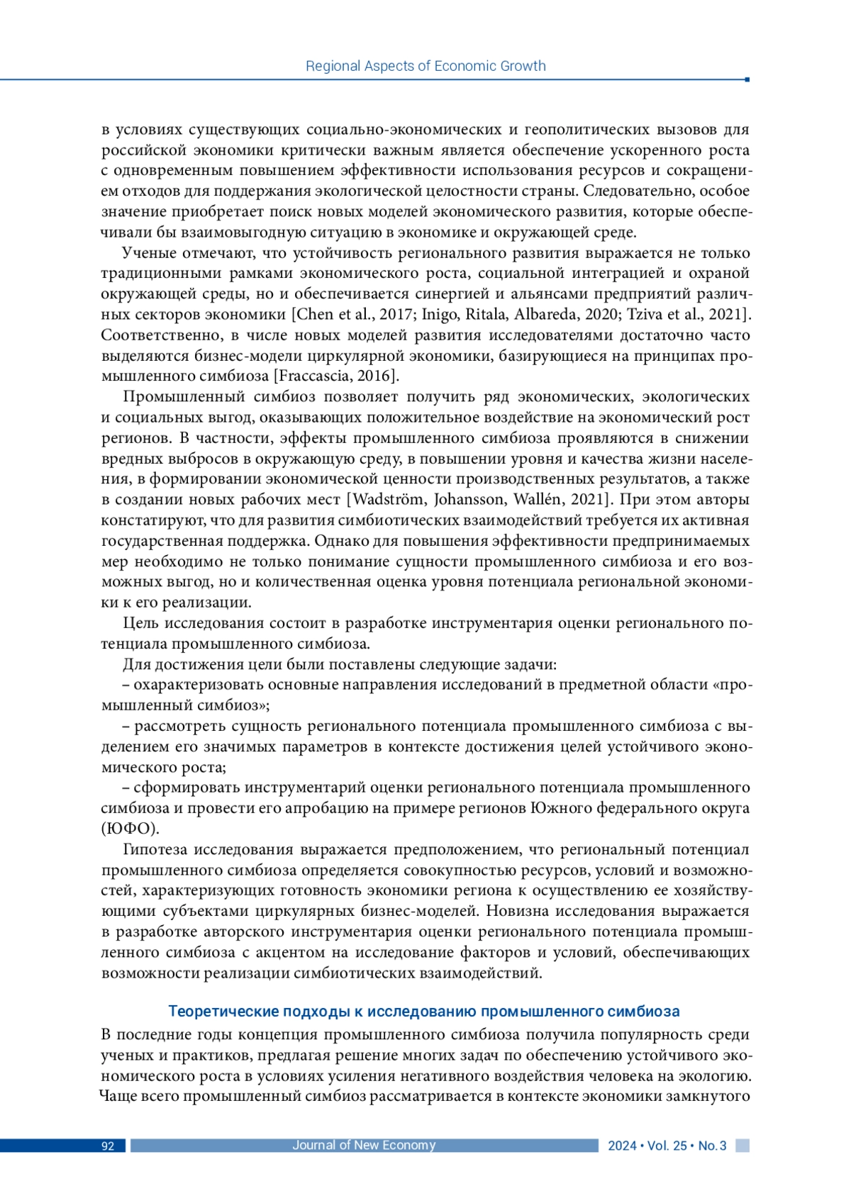 Постоянно возрастающее негативное воздействие экономического роста на окружающую среду обусловливает необходимость внедрения бизнес-моделей циркулярной экономики, базирующихся на принципах промышленного симбиоза. Однако для развития промышленного симбиоза необходимо не только понимание его сущности и возможных выгод, но и оценка потенциала региональной экономики к реализации симбиотических взаимодействий. Статья направлена на разработку инструментария оценки регионального потенциала промышленного симбиоза. Методология исследования базируется на концепции промышленного симбиоза и системной парадигме Г. Б. Клейнера. В исследовании использованы индексный и матричный методы. Информационную базу составили данные Росстата и Федеральной службы по надзору в сфере природопользования за 2021–2022 гг. по регионам ЮФО. В результате предложен инструментарий оценки регионального потенциала промышленного симбиоза, представляющий собой систему показателей оценивания его основных компонентов и типологизацию регионов по уровню развития потенциала промышленного симбиоза. Определено, что Ростовская и Астраханская области, а также Республика Крым обладают наибольшим потенциалом к развитию симбиотических взаимодействий. Исследование вносит вклад в развитие теоретических представлений в области циркулярной экономики с точки зрения понимания факторов и условий, необходимых для реализации процессов промышленного симбиоза в регионе. Практическая значимость работы выражается в возможности использования полученных результатов при формировании методических подходов к разработке проектов промышленного симбиоза как элемента стратегии социально-экономического развития российских регионов