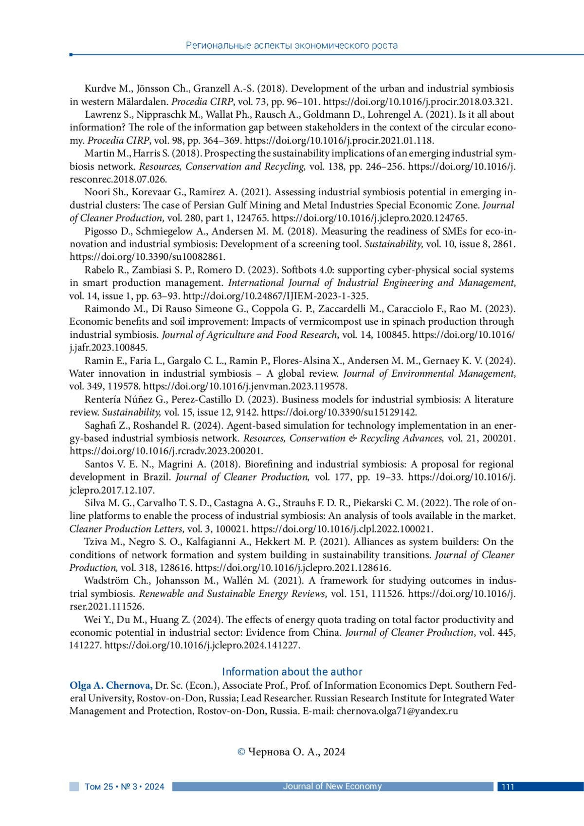 9. Преображенский Б. Г., Толстых Т. О., Шмелева Н. В. (2020). Промышленный симбиоз как инструмент циркулярной экономики // Регион: системы, экономика, управление. № 4 (51). С. 37-48. DOI: 10.22394/1997-4469-2020-51-4-37-48 EDN: GPXUMW