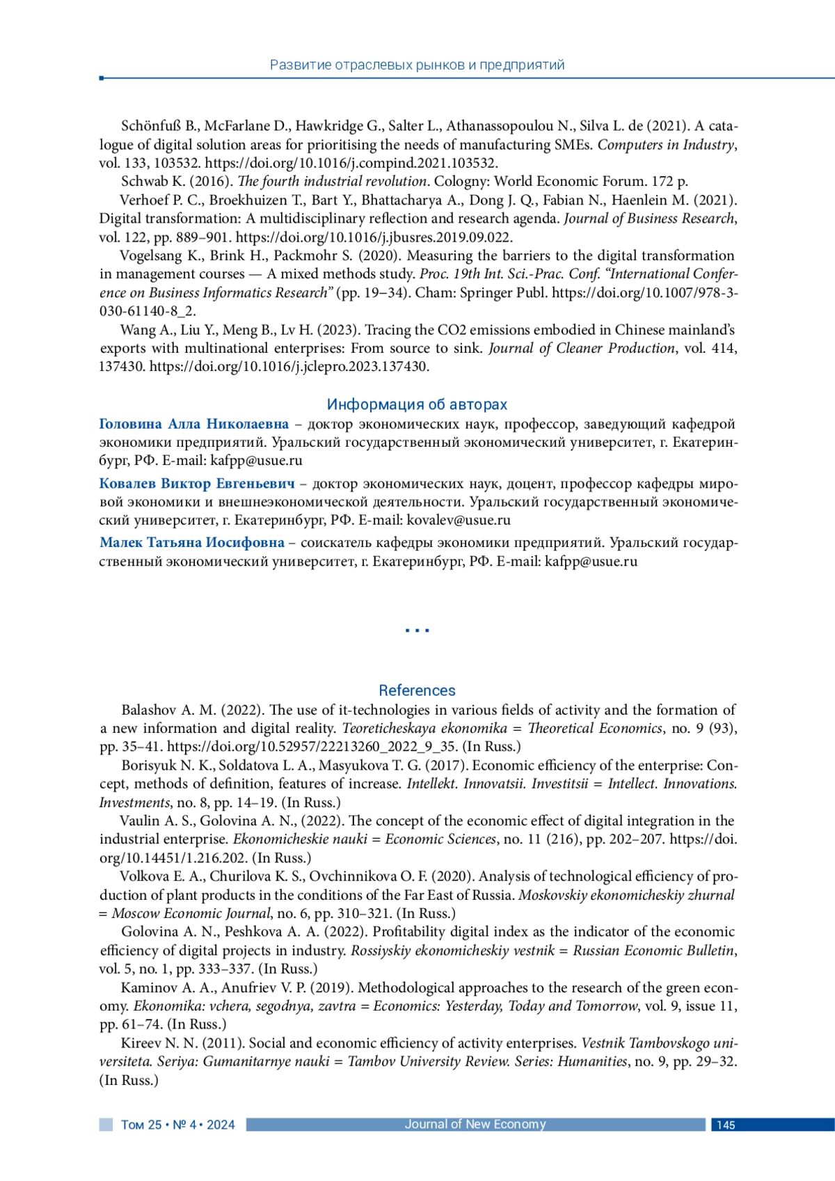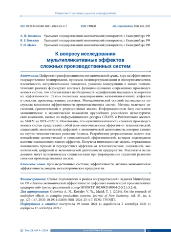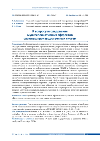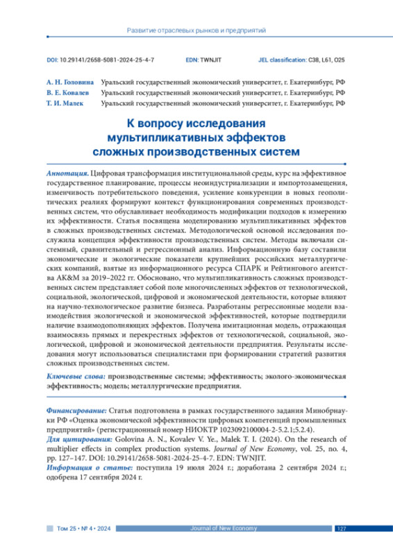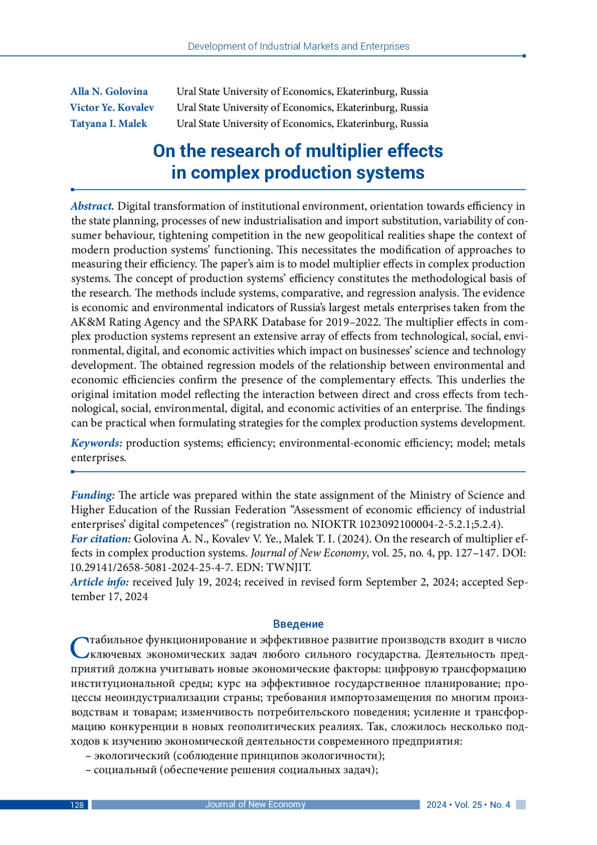 ГОЛОВИНА А. Н., КОВАЛЕВ В. Е., МАЛЕК Т. И. К ВОПРОСУ ИССЛЕДОВАНИЯ МУЛЬТИПЛИКАТИВНЫХ ЭФФЕКТОВ СЛОЖНЫХ ПРОИЗВОДСТВЕННЫХ СИСТЕМ // JOURNAL OF NEW ECONOMY. 2024. Т. 25 № 4