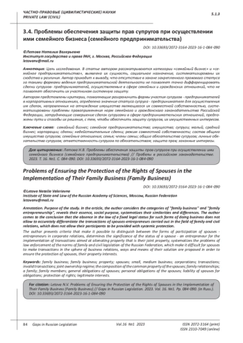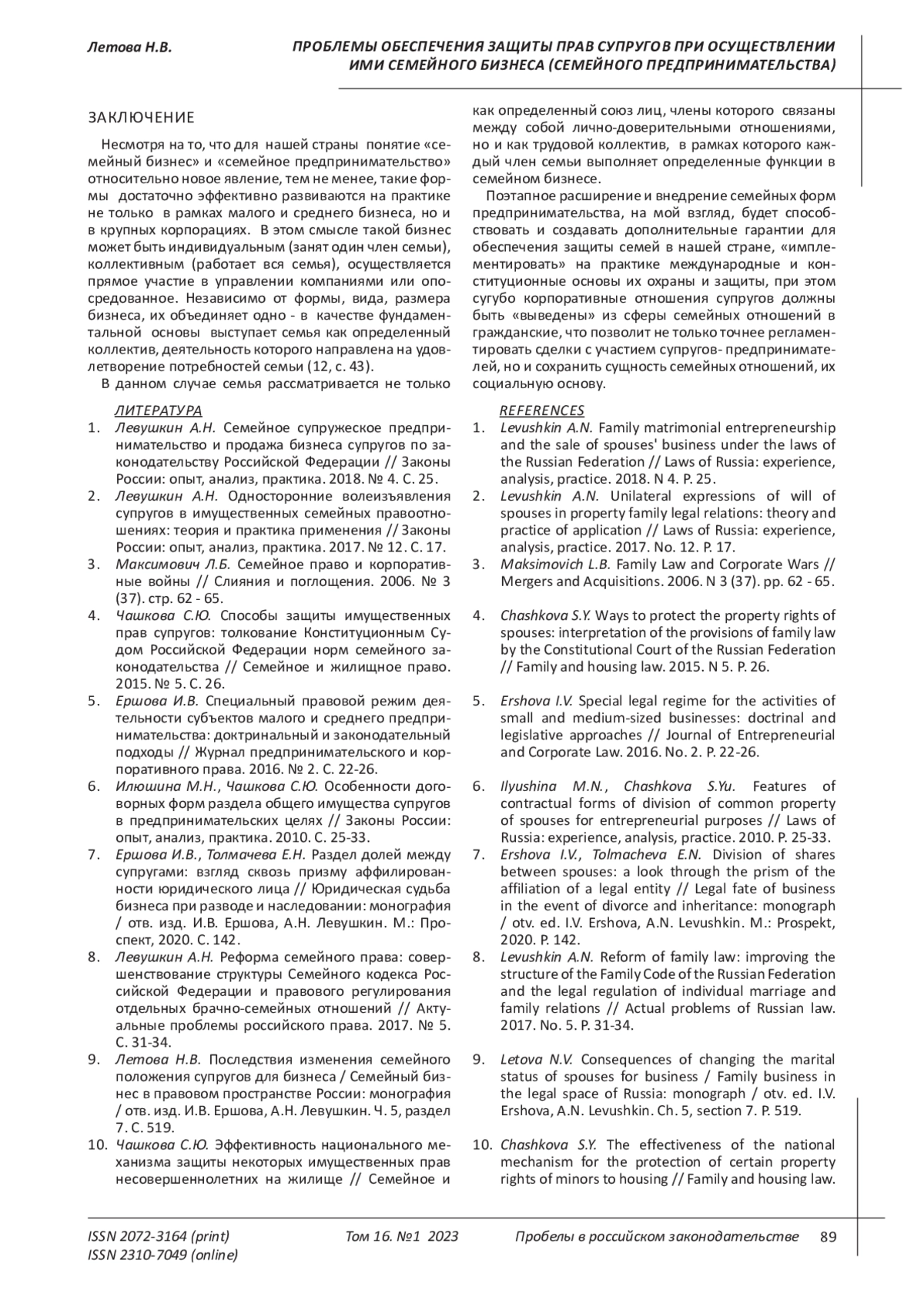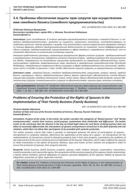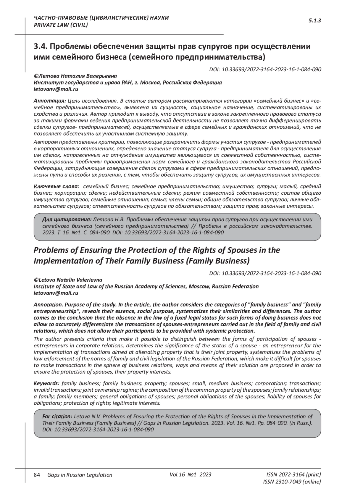 ЛЕТОВА Н. В. ПРОБЛЕМЫ ОБЕСПЕЧЕНИЯ ЗАЩИТЫ ПРАВ СУПРУГОВ ПРИ ОСУЩЕСТВЛЕНИИ ИМИ СЕМЕЙНОГО БИЗНЕСА (СЕМЕЙНОГО ПРЕДПРИНИМАТЕЛЬСТВА) // ПРОБЕЛЫ В РОССИЙСКОМ ЗАКОНОДАТЕЛЬСТВЕ. 2023. Т. 16 № 1