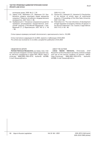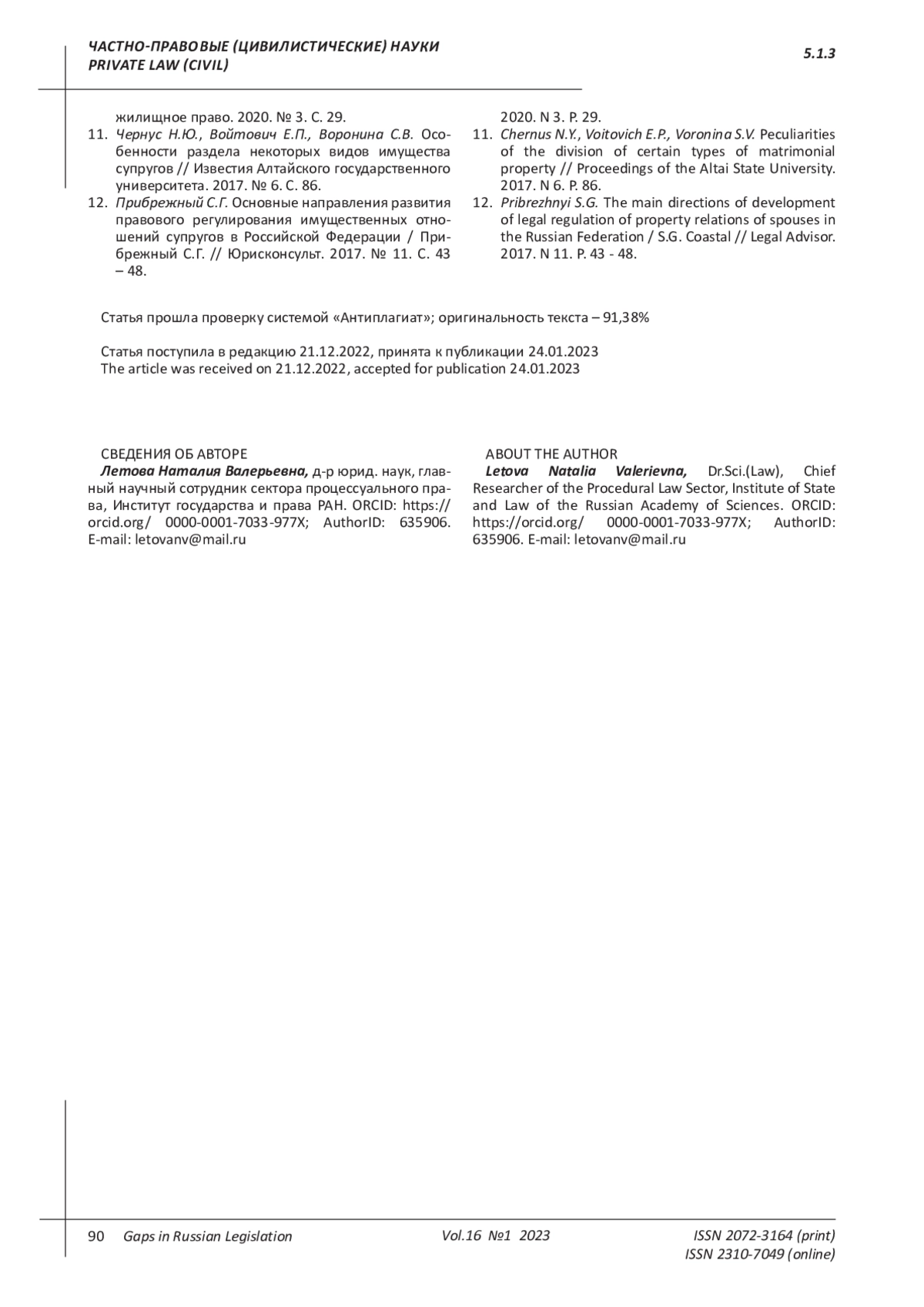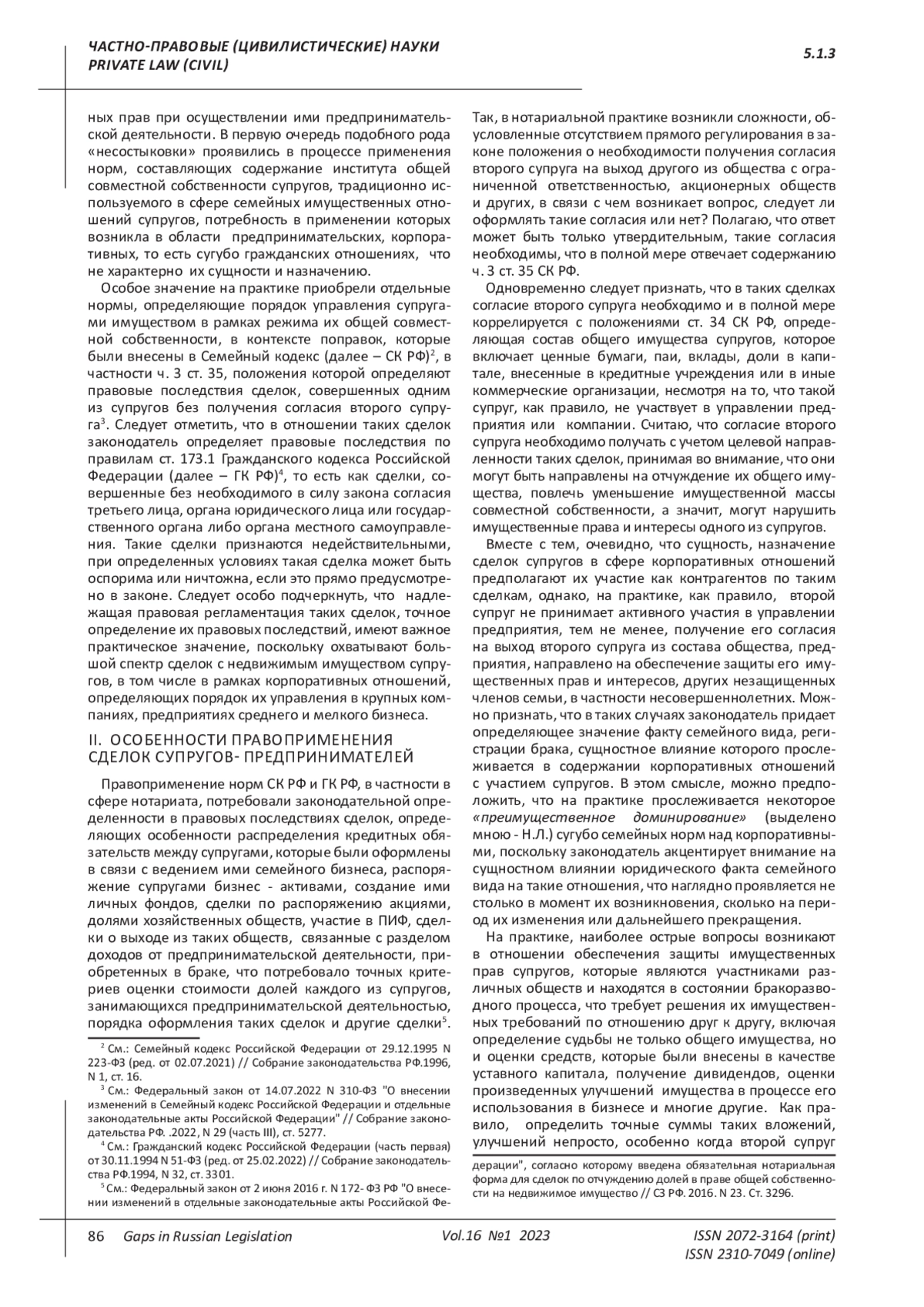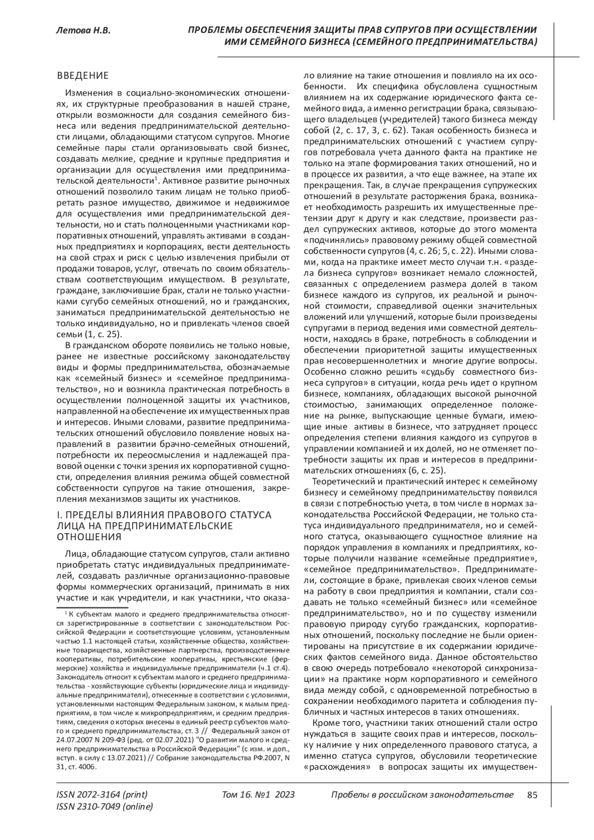 ЛЕТОВА Н. В. ПРОБЛЕМЫ ОБЕСПЕЧЕНИЯ ЗАЩИТЫ ПРАВ СУПРУГОВ ПРИ ОСУЩЕСТВЛЕНИИ ИМИ СЕМЕЙНОГО БИЗНЕСА (СЕМЕЙНОГО ПРЕДПРИНИМАТЕЛЬСТВА) // ПРОБЕЛЫ В РОССИЙСКОМ ЗАКОНОДАТЕЛЬСТВЕ. 2023. Т. 16 № 1