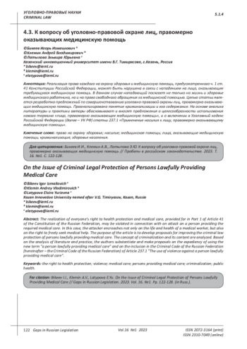 41 Конституции Российской Федерации, может быть нарушена в связи с нападением на лицо, оказывающее требующуюся медицинскую помощь. В данном случае нападающий посягает не только на жизнь и здоровье медицинского работника, но и на право свободного обращения за медицинской помощью. Целью статьи является разработка предложений по совершенствованию уголовно-правовой охраны лиц, правомерно оказывающих медицинскую помощь. Проанализировано понятие криминализации и его содержание. На основе анализа литературы и практики авторы обосновывают и вносят предложения о целесообразности использования нового термина «лицо, правомерно оказывающее медицинскую помощь», и о включении в Уголовный кодекс Российской Федерации (далее - УК РФ) статьи 237.1 «Применение насилия к лицу, правомерно оказывающему медицинскую помощь».