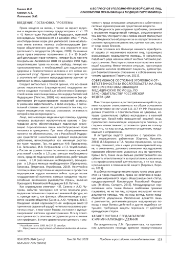 Poniatovskaya T.G. Criminal law guarantees of medical care // Proceedings of the Southwestern State University. Series: History and Law. 2020. Vol. 10. No. 1. pp. 62-70.