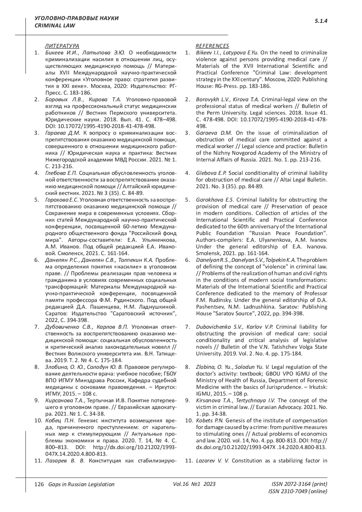 1. Бикеев И.И., Латыпова Э.Ю. О необходимости криминализации насилия в отношении лиц, осуществляющих медицинскую помощь // Материалы XVII Международной научно-практической конференции “Уголовное право: стратегия развития в XXI веке”. Москва, 2020: Издательство: РГ-Пресс. С. 183-186. EDN: IKSEIR