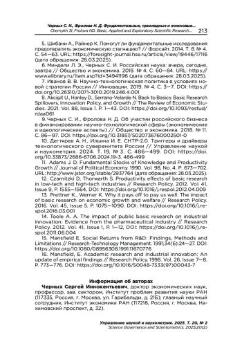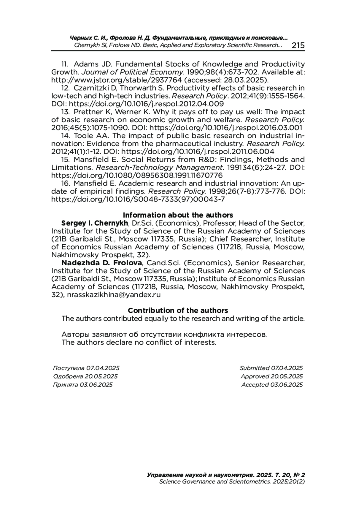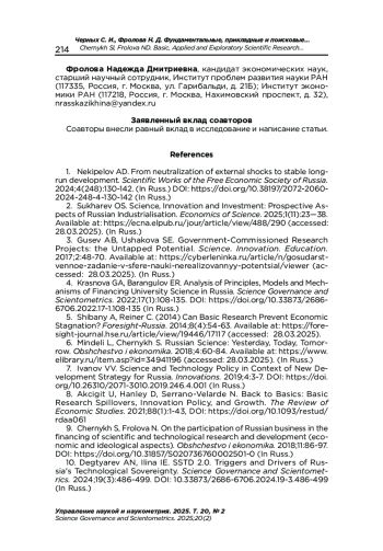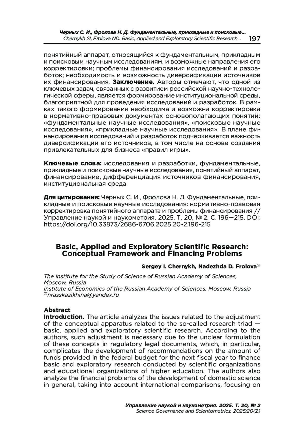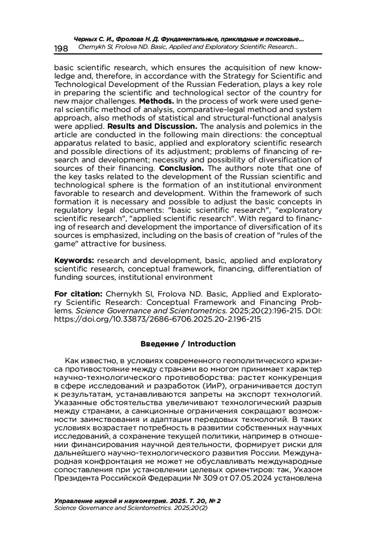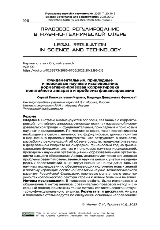 ЧЕРНЫХ С. И., ФРОЛОВА Н. Д. ФУНДАМЕНТАЛЬНЫЕ, ПРИКЛАДНЫЕ И ПОИСКОВЫЕ НАУЧНЫЕ ИССЛЕДОВАНИЯ: НОРМАТИВНО-ПРАВОВАЯ КОРРЕКТИРОВКА ПОНЯТИЙНОГО АППАРАТА И ПРОБЛЕМЫ ФИНАНСИРОВАНИЯ // УПРАВЛЕНИЕ НАУКОЙ И НАУКОМЕТРИЯ. 2025. Т. 20 № 2