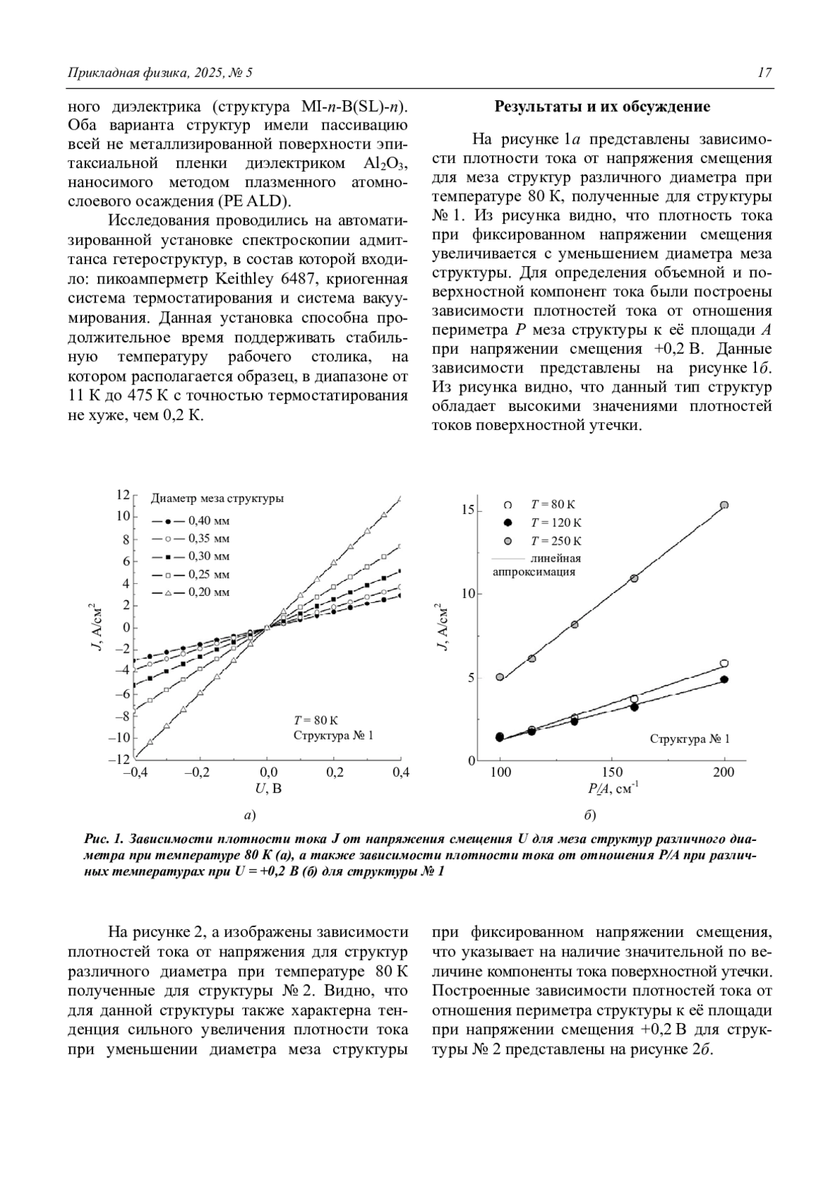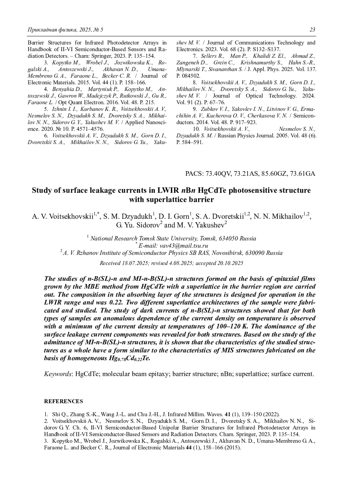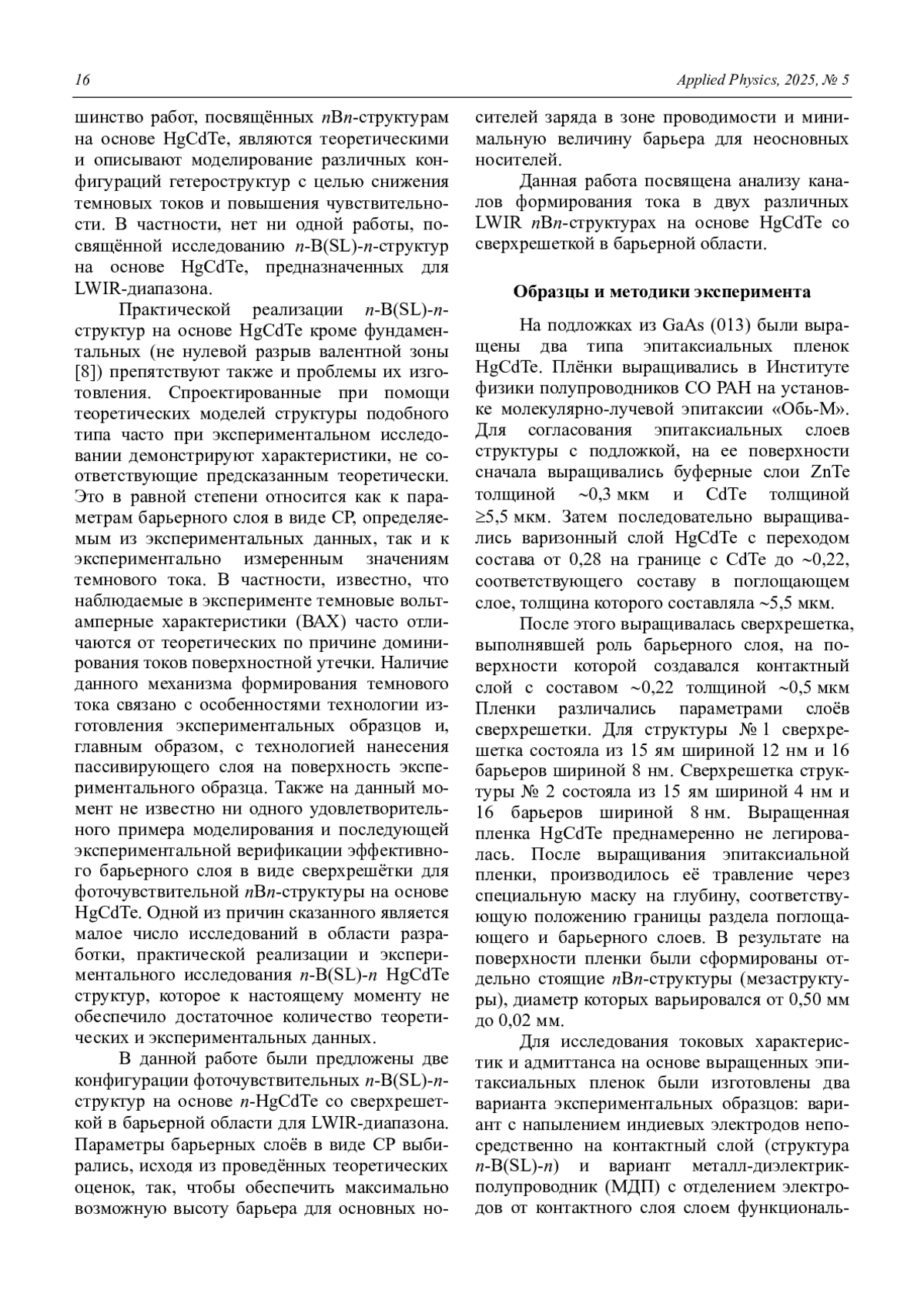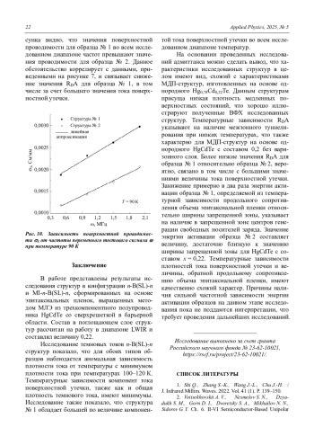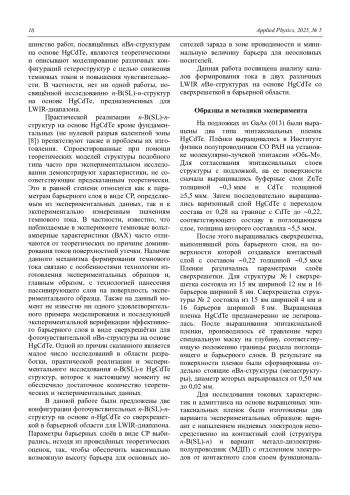 Проведены исследования структур в конфигурациях n-B(SL)-n и MI-n-B(SL)-n, сформированных на основе эпитаксиальных пленок, выращенных методом молекулярно-лучевой эпитаксии (МЛЭ) из HgCdTe со сверхрешеткой в барьерной области. Состав в поглощающем слое структур рассчитан на работу в диапазоне LWIR и составлял величину 0,22. Было изготовлено и исследовано два образца с разной архитектурой сверхрешетки. Исследование темновых токов n-B(SL)-n структур показало, что для обоих типов образцов наблюдается аномальная зависимость плотности тока от температуры с минимумом плотности тока при температурах 100–120 К. Выявлено доминирование компонент тока поверхностной утечки для обеих структур. На основании исследования адмиттанса структур MI-n-B(SL)-n показано, что характеристики исследованных структур в целом имеют вид, схожий с характеристиками МДП-структур, изготовленных на основе однородного Hg0,78Cd0,22Te.
