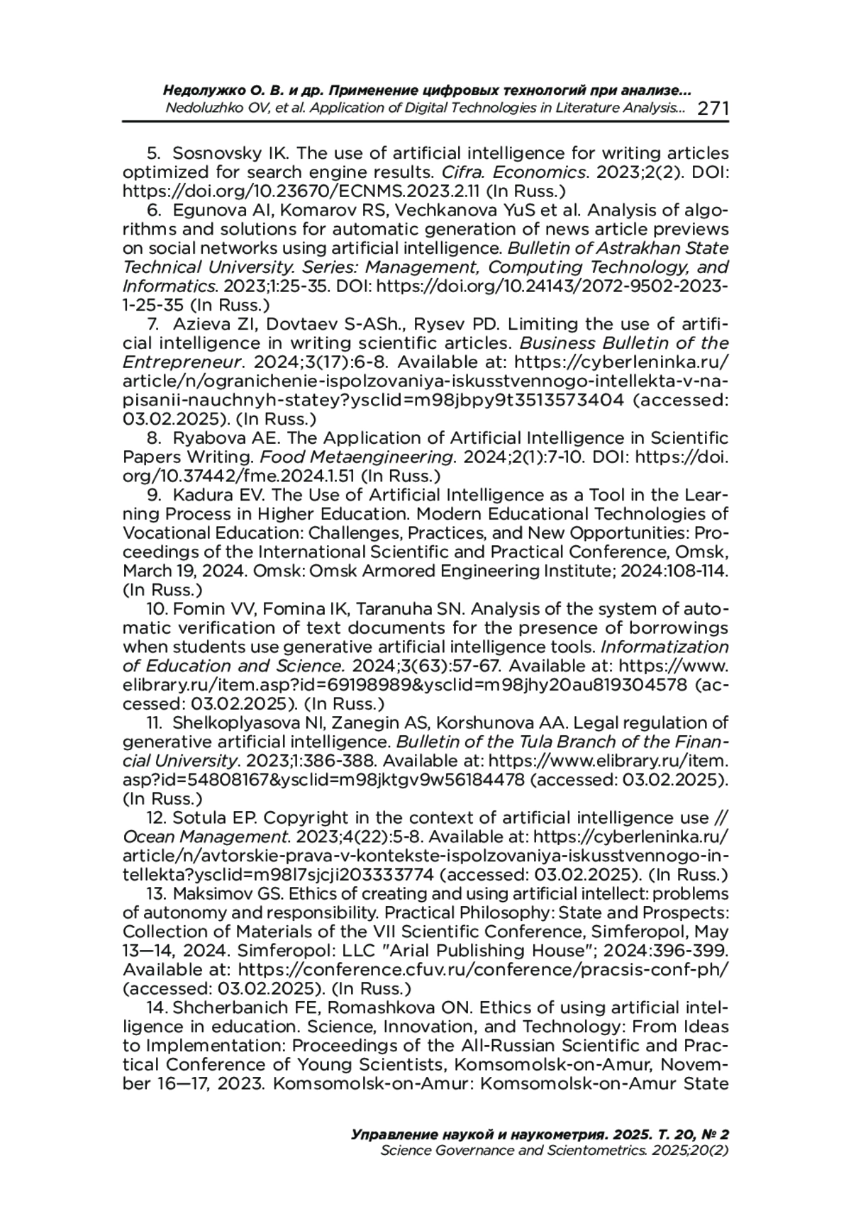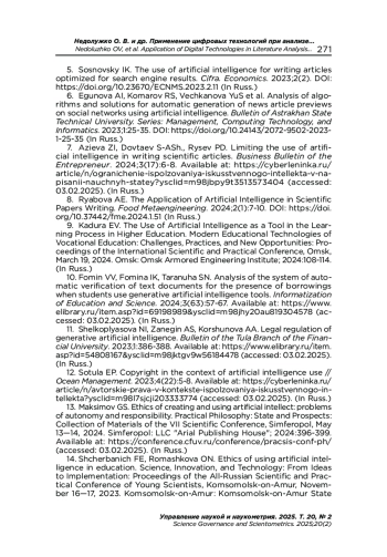 7. Азиева З. И., Довтаев С.-А. Ш., Рысев П. Д. Ограничение использования искусственного интеллекта в написании научных статей // Деловой вестник предпринимателя. 2024. № 3(17). С. 6-8. URL: https://cyberleninka.ru/article/n/ogranichenie-ispolzovaniya-iskusstvennogo-intellekta-v-napisanii-nauchnyh-statey?ysclid=m98jbpy9t3513573404 (дата обращения: 03.02.2025). EDN: WBUACR