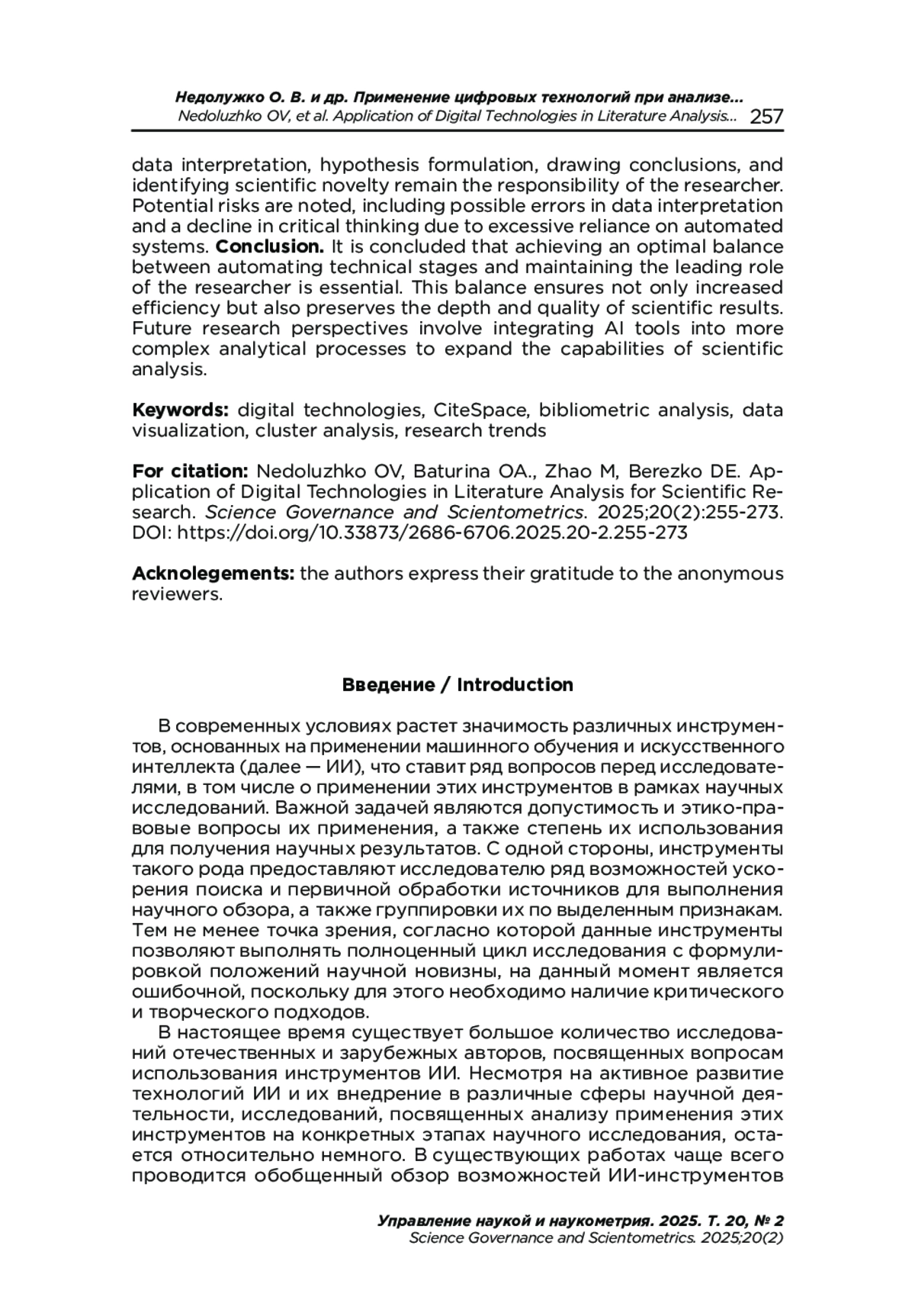 Результаты и дискуссия. Показано, что использование CiteSpace позволяет автоматизировать процессы отбора источников, анализа ключевых терминов, построения сетевых карт соавторства, визуализации взаимосвязей между публикациями и кластеризации тематических направлений. Применение подобных инструментов значительно ускоряет обработку данных и облегчает выявление исследовательских трендов. Однако, несмотря на широкий функционал, ИИ-инструменты выполняют преимущественно вспомогательную роль, поскольку критическая интерпретация данных, формулирование гипотез, выводов и положений научной новизны остаются задачами исследователя. Отмечены потенциальные риски, связанные с возможными ошибками в интерпретации данных и снижением критического подхода при чрезмерной зависимости от автоматизированных систем.