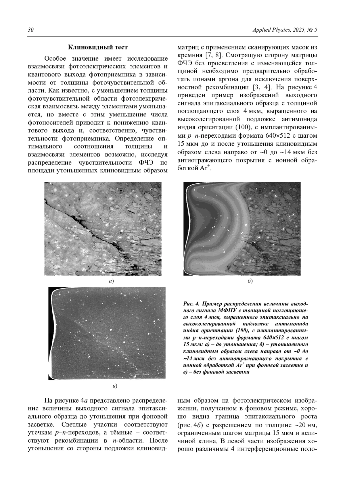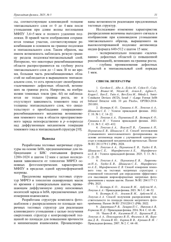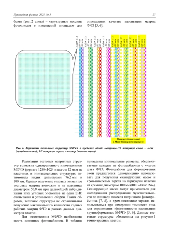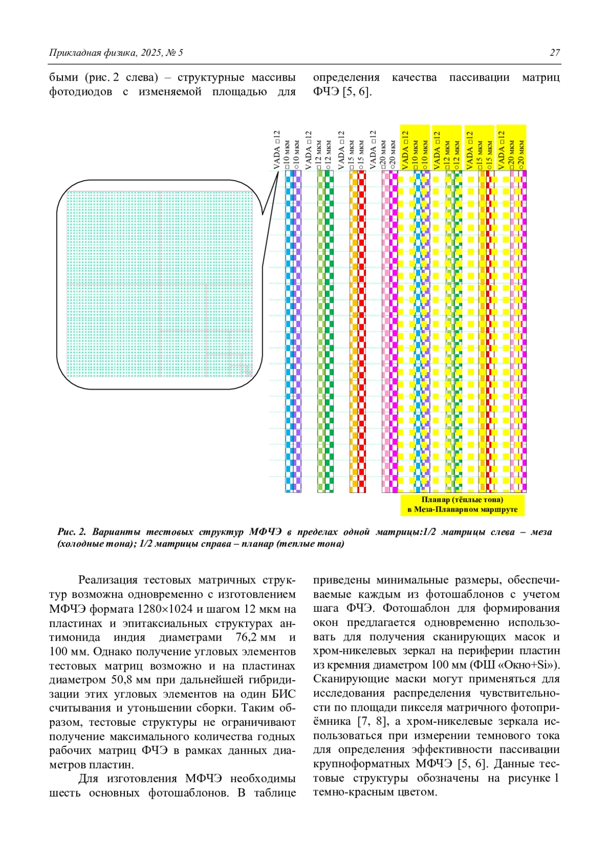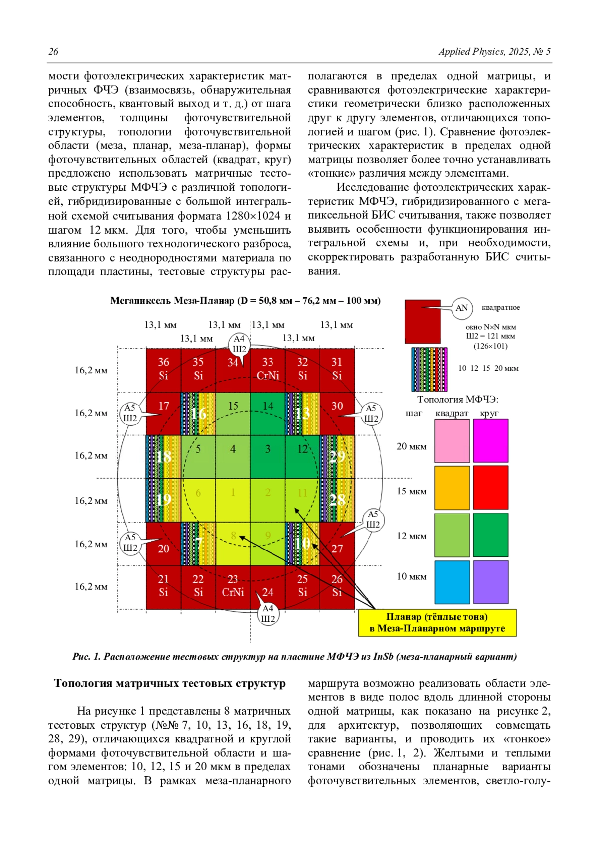 С целью получения и сравнения основных фотоэлектрических характеристик МФПУ в пределах одной крупноформатной матрицы, разработаны топологии тестовых матричных структур на основе InSb с квадратной и круглой формами фоточувствительной области, шагом элементов 10, 12, 15 и 20 мкм, предназначенных для гибридизации с БИС считывания формата 12801024 и шагом 12 мкм. Представлена структура комплекта фотошаблонов с матричными тестовыми элементами для реализации клиновидного утоньшения с целью получения сверхтонких структур с контролируемой толщиной для повышения прочности и минимизации взаимосвязи. Проанализированы возможности реализации предложенных тестовых структур.